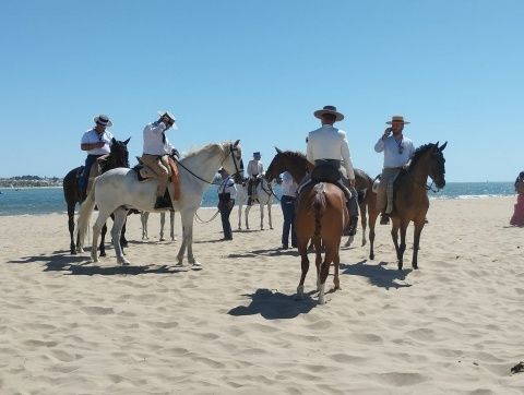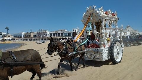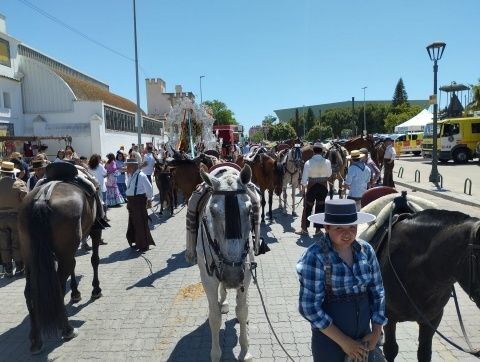 La carreta de plata que porta el Simpecado roteño ha pisado las primeras arenas en una jornada que empezaba con la Misa de Romeros, un recorrido más corto que otros años hasta llegar a la barriada de la Blanca Paloma y hacer parada en la explanada del cementerio donde se ha rezado el primer Ángelus. Desde ahí, una vez reorganizado el cortejo, los 300 rocieros roteños han enfilado los primeros kilómetros por vías pecuarias ya que este año como novedad, se ha intentado no coger ningún tramo de carretera.