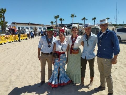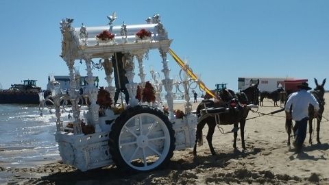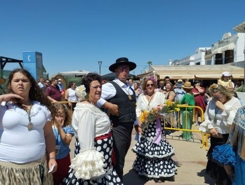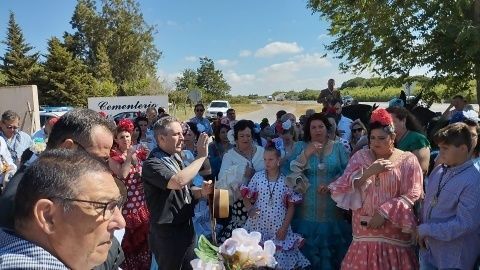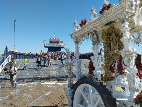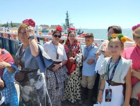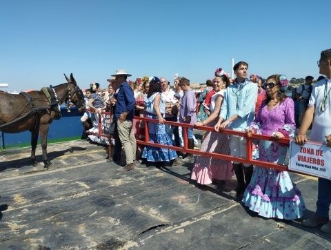 Las primeras horas como siempre, se están viviendo con mucha intensidad y sobre todo, con muchas ganas de reencontrarse con Nuestra Señora del Rocío en su ermita, por eso, han sido reiterados los vítores y cantes dedicados a la Blanca Paloma. Antes del embarque, como es habitual, el Simpecado de la Hermandad de Rota, como el resto de hermandades, ha hecho parada en la capilla del Carmen para el rezo antes de continuar.