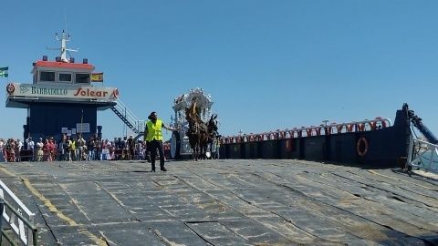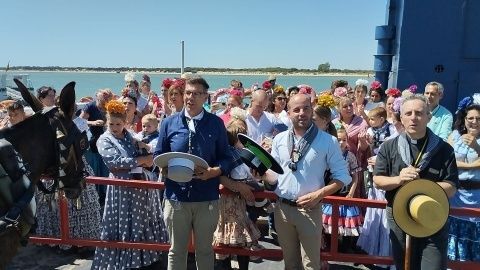 Pasadas las cuatro de la tarde, la Hermandad de Nuestra Señora del Rocío de Rota ha realizado el embarque desde Bajo Guía en Sanlúcar para llegar a coto de Doñana y continuar así este primer día de camino hacia la aldea de El Rocío.