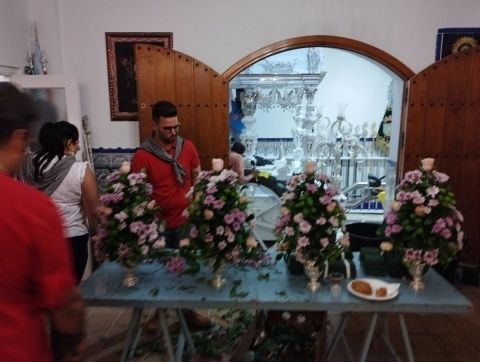 Por eso, en estas horas previas, se ha estado limpiando la carreta que durante el camino ha portado el Simpecado hasta la aldea de El Rocío, y se ha engalanado con flores para que luzca perfecta para un momento tan esperado como entrar en la ermita ante la virgen y presentarse ante ella.