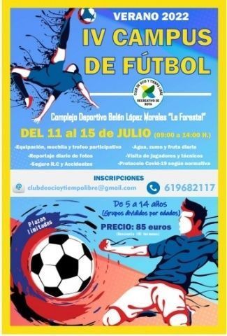 Por último, del 11 al 15 de julio se celebrará el IV Campus de Fútbol, en el complejo deportivo "Belén López Morales", de 9.00 a 14.00 horas, donde jugadores y técnicos visitarán a los participantes para ayudarles a mejorar su técnica en el campo de fútbol. Está dirigido a niños de entre 5 y 14 años, aunque se dividirán en dos grupos por edades. Las inscripciones incluyen mochila, equipación y trofeo participativo; agua, zumo y fruta diaria y seguro de responsabilidad civil y accidentes. Los hermanos también tienen descuentos.