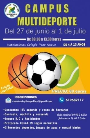 Por otro lado, del 17 de junio al 1 de julio, se celebrará el Campus Multideporte, de 9.30 a 13.30 horas, en las instalaciones del colegio Pozo Nuevo, dirigido a niños de entre 4 y 13 años. Deporte, juegos de agua y manualidades son algunas de las actividades que se ofrecen. Las inscripciones incluyen camiseta, mochila y recuerdo, seguro de responsabilidad civil y accidentes. En este caso, los hermanos también tienen descuentos.