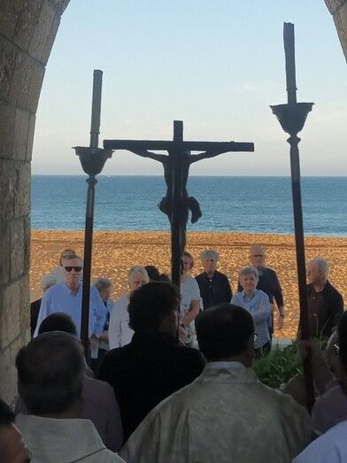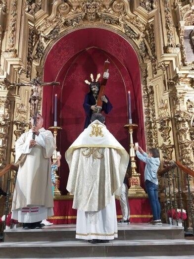 Hoy, oficiada por el cura párroco de la iglesia de Nuestra Señora de la O, José Arjona Gil, en el arco del paseo marítimo cercano al hotel Duque de Nájera, han participado fieles y devotos así como hermanos de la Hermandad del Nazareno que hace años retomó esta celebración tras varios años de interrupción para que esta tradición no se perdiera en la villa.