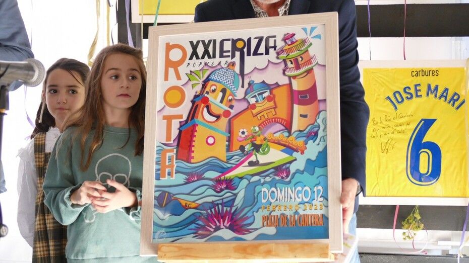 Su cartel es muy colorido, con un aire de animación infantil, donde no ha olvidado guiños a Rota con el faro, la Torre de la Merced, los imprescindibles erizos protagonistas de la Erizá que anuncia, la bandera del Cádiz, el camaleón y un detalle que a partir de ahora, como ha indicado la peña, se incluirá en todos los carteles de este acto: un micrófono con los colores del Cádiz (amarillo y azul) con la iniciales B.C. como recuerdo a Bernardo Cala, fallecido el pasado verano que fue durante 20 ediciones presentador de la Erizá Popular, fiel colaborador de la peña y querido por todos los socios por su labor siempre altruista. Será el eterno homenaje a este gran carnavalero.