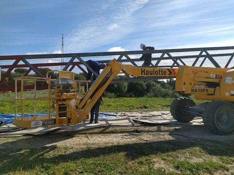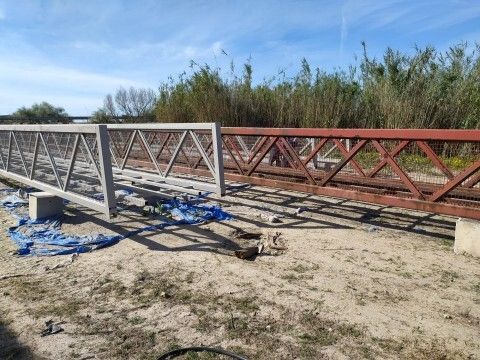 Los trabajos de reparación de los pasos elevados de la vía verde de Rota en dirección hacia Costa Ballena siguen avanzando y tras la retirada de los tramos principales de las dos pasarelas, que se están reparando en talleres especializados, en estos días los trabajos continúan “in situ”. Se están realizando diversas labores de arreglos y sustitución de las planchas del suelo y las barandillas de estos puentes, así como aplicando tratamientos de protección con pintura anticorrosiva en las estructuras laterales de ambas pasarelas.