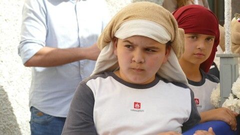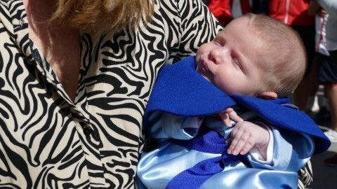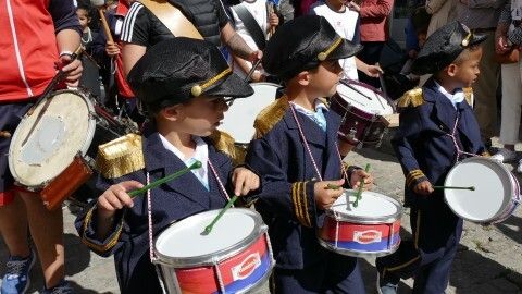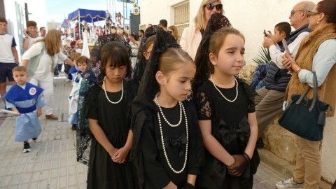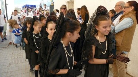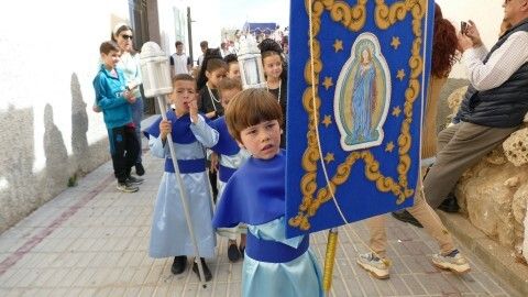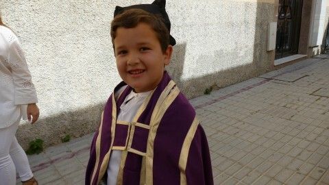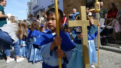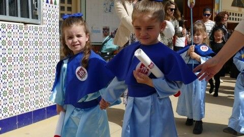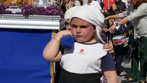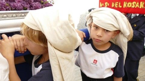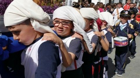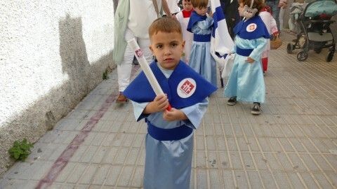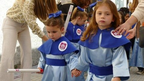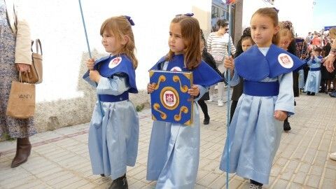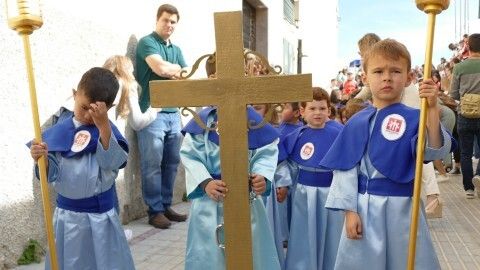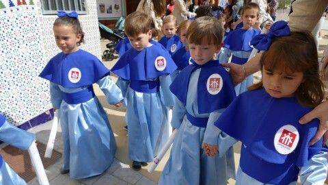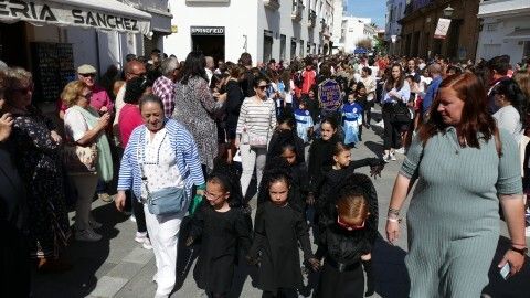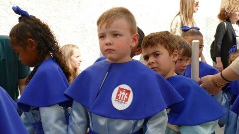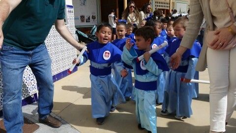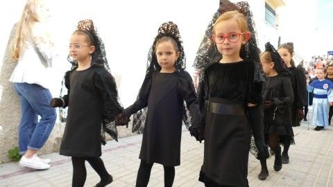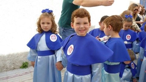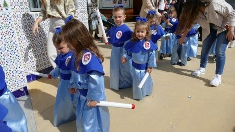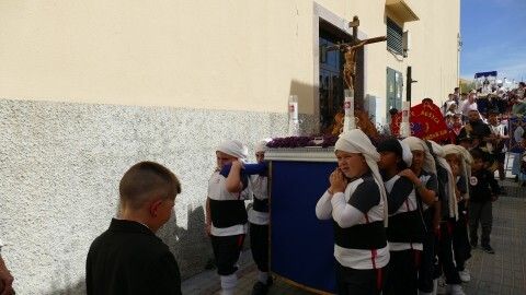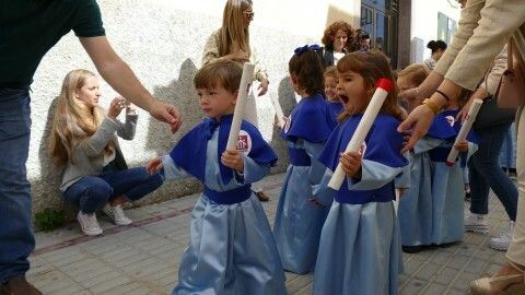 El alboroto marca esta singular salida procesional en la que han participado 150 niños de los cursos de Infantil y de 1º y 2º de Primaria. El desorden en la fila y los intentos en vano de los profesores y colaboradores para que el cortejo no se desmadre demasiado, es tarea harto complicada y forma parte de la puesta en escena que se va desarrollando con la espontaneidad de sus protagonistas.