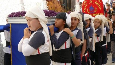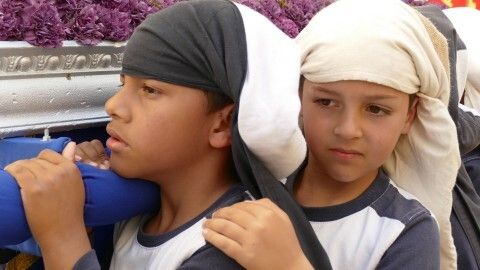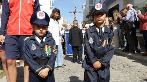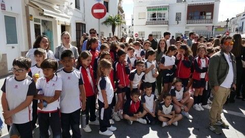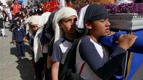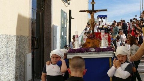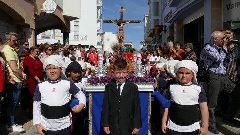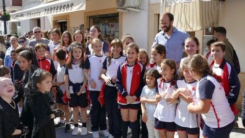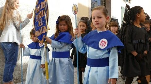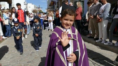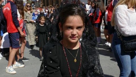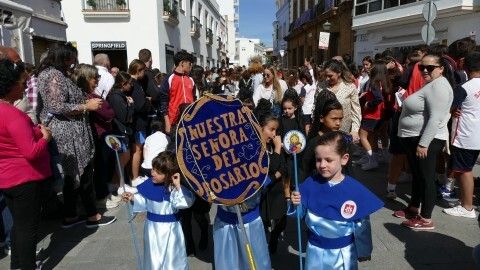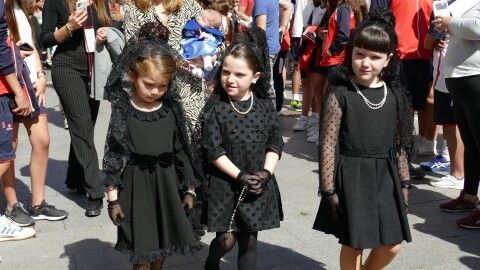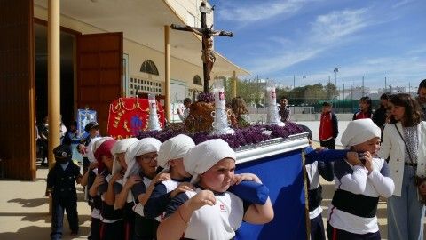 Con unas temperaturas más que primaverales, que han hecho sudar a los pequeños del cortejo, y en especial a los cargadores, partía esta singular comitiva a la que pocos se han resistido a inmortalizar con fotos y vídeos. Y es que ver a los alumnos de este centro educativo lucir de penitentes, con insignias en algunos casos, niñas de mantilla, músicos, monaguillos, costaleros y hasta un obispo, es una cita que cada año, revoluciona el casco histórico por donde pasan.