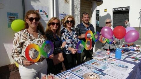 El alcalde de Rota, Javier Ruiz Arana, la teniente de alcalde, el delegado de Participación Ciudadana, José Antonio Medina, la teniente de alcalde Encarna Niño y la delegada de Igualdad, Luisa Fernández, han visitado esta mesa informativa para mostrar el apoyo del Ayuntamiento a la asociación roteña y así destacar la labor de concienciación y visibilización que realizan a lo largo de todo el año.