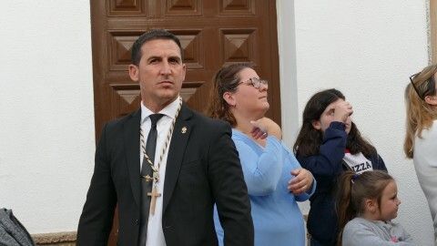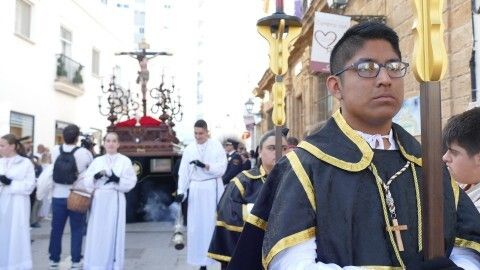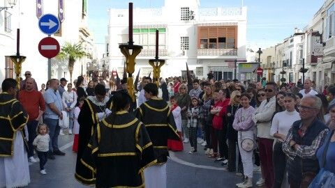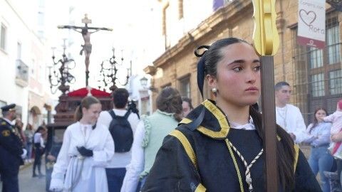 [Img #188953]Pasadas las seis y media de la tarde abría paso la cruz de guía a la que seguía un breve tramo de hermanos y una representación de la Hermandad del Rocío con quien comparte sede canónica, precediendo al Santísimo Cristo del Amor. Este Jesús crucificado  volvía este año a pisar un monte de claveles rojos y lucía unas potencias plateadas. El Amor ha procesionado escoltado por dos miembros de Protección Civil, hermano honorario de la Hermandad del Amor, y ha estado cargado por una cuadrilla de costaleros guiada por José Antonio Moreno Puyana como capataz, acompañado por los contraguías José Miguel Heredia Puyana, Antonio Ruiz Pazos, Antonio Ruiz Peña y Javier Pico de Coaña. El son lo marcaban las marchas procesionales de la Banda de Cornetas "Alfonso X El Sabio" de El Puerto de Santa María, a la que seguía un nuevo tramo de hermanos con insignias, varas y cirios, y un pequeño grupo de niños en la pavera que ha dejado con la entrega de caramelos y estampas algunas imágenes muy entrañables de la que será cantera de la hermandad.