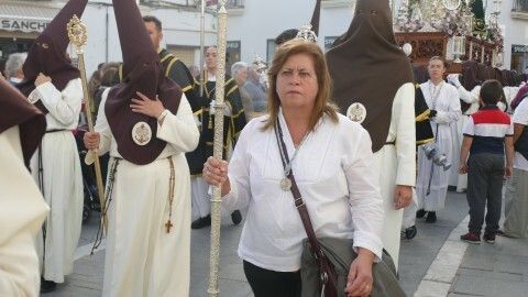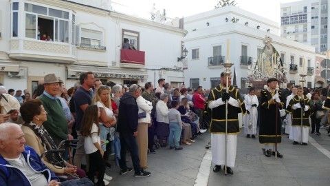 [Img #188979]La Esperanza ha ido al vaivén que ha seguido la amplia cuadrilla de cargadoras, la única formada íntegramente por mujeres, que son el especial atractivo de este cortejo. Verlas cargar por fuera, algo que no es tan habitual en el resto de procesiones de Rota (a excepción del Nazareno y el Resucitado), es una estampa que engrandece el paso de la virgen que hoy iba guiado por los capataces José Álvarez Moreno y Alfonso Bernal García de Quirós, los contraguías María del Carmen Mateos García y José Antonio García Rodríguez. La Asociación Cultural  Banda de Música de Barbate ha acompañado con las marchas procesionales y las cargadoras se han lucido en algunos puntos.
