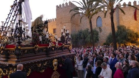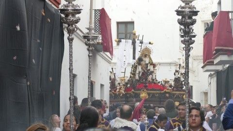 El cortejo ha avanzado por las calles del casco histórico con algún cambio en el itinerario habitual, con especiales momentos en la calle O'Donell, donde la virgen y el cristo recibieron una petalada tanto desde el balcón de una de las viviendas, como a sus pies, para que los costaleros pisaran un manto de flores a su paso. En ese mismo punto, también el saetero Agustín Sánchez Nogales dedicó una saeta a los titulares de esta hermandad que ha lucido esplendorosa por la calle aunque con un viento de levante muy desagradable.