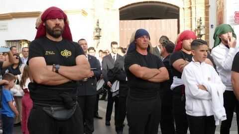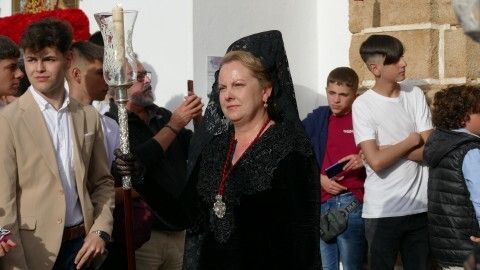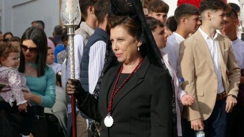 En poco más de quince minutos, el cortejo de nazarenos, en el que también iban las mujeres de mantilla española de riguroso negro, estaba desfilando por la calle y era el turno de la cuadrilla de costaleros que, guiada por Manuel Acuña y Rafael Linares, ha tenido que maniobrar para sortear la dificultad que supone salir por la puerta de la ermita tan pequeña y estrecha. La corona de la virgen casi toca el techo, por eso, los costaleros se tienen que echar cuerpo a tierra hasta atravesar el dintel y con ello, recibir el aplauso de todos los presentes que de esta forma, reconocen el mérito de quien va bajo las trabajaderas.