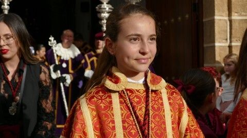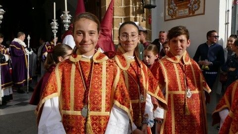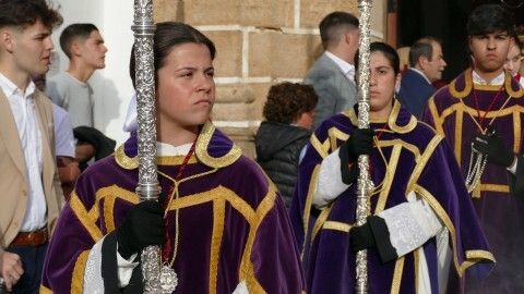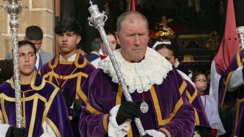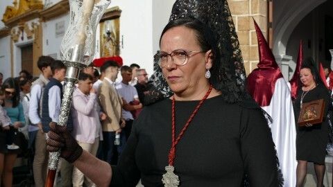 Destacado es también el patrimonio cofradiero de Los Dolores, uno de los más rico, si no el que más, de los que se lucen en estos días de recuerdo de la pasión, muerte y resurrección de Jesús. Entre sus insignias, destaca una peculiar que fue estreno el año pasado y que en esta salida portaba una de las mujeres de mantilla, el Libro de Hermanos Difuntos. Un libro que lleva en su interior la ficha de hermanos de Los Dolores ya fallecidos, aquellos hombres y mujeres que con su devoción transmitieron su fe a otras generaciones para que la hermandad siguiera creciendo. Y así ha ocurrido porque este año, el cortejo contaba con un mayor número de hermanos que el año pasado, según el hermano mayor, Manuel García.