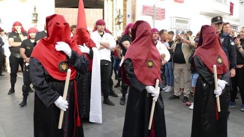 A las siete de la tarde, puntual, abrían las puertas de la capilla de la Caridad y el cortejo de hermanos penitentes empezaba a desfilar con cirios e insignias a un ritmo bastante acelerado ante una plaza de Andalucía que estaba repleta, con ganas de ver una salida procesional que gusta mucho.