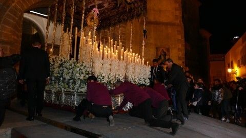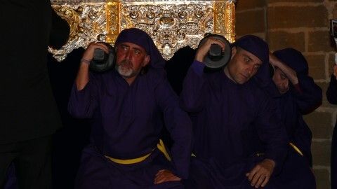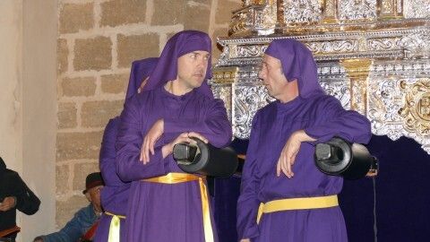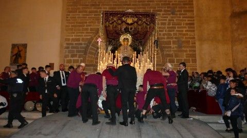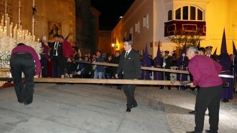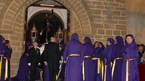 Con algunos nazarenos ya en la plaza, enseguida la cuadrilla de costaleros de la virgen ha empezado las maniobras para montar el paso, guiado por el capataz Pablo Barba, y poder posicionarse a la derecha de la iglesia mayor para esperar la salida del Señor de Rota. Ha sido a los pocos minutos, sobre las 2.25 horas cuando Jesús Nazareno aparecía por el dintel de la puerta de la parroquia donde los costaleros, guiados por Diego Mateos Laynez, han tenido que maniobrar igualmente para salir a la calle.