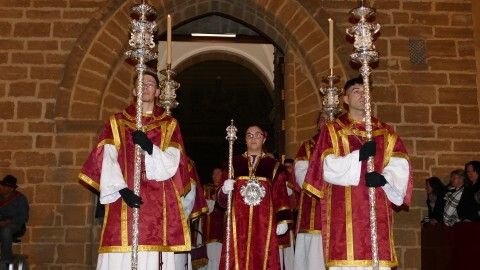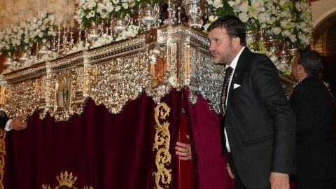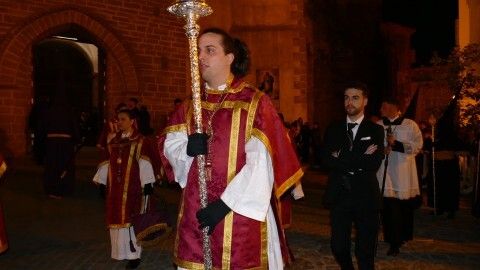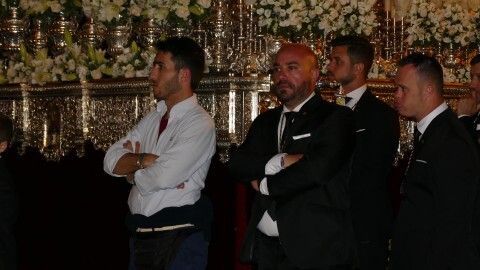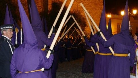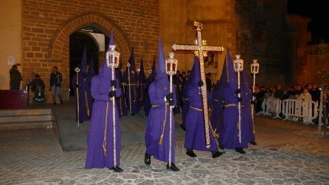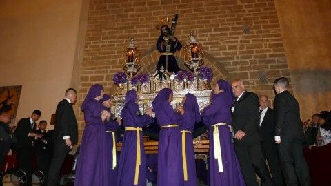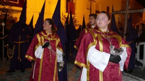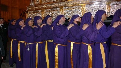 A las dos de la madrugada abrían las puertas de la parroquia de Nuestra Señora de la O y comenzaba el desfile de algunos de los hermanos con túnica morada, varas e insignias que se han ido posicionando en la plaza Bartolomé Pérez a la espera de que los titulares protagonistas en esta larga noche, ocuparan su lugar para el Sermón de Pasión.