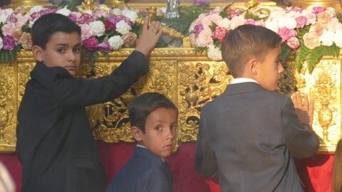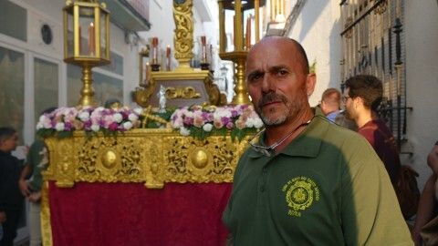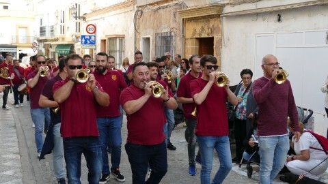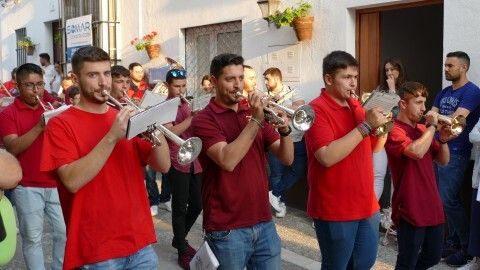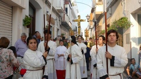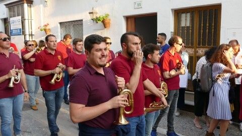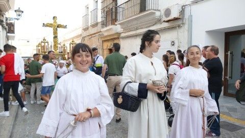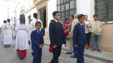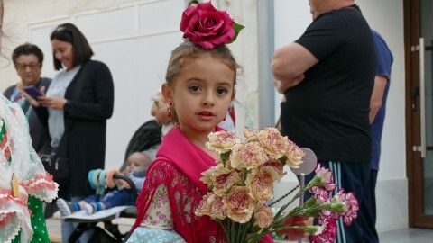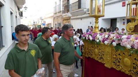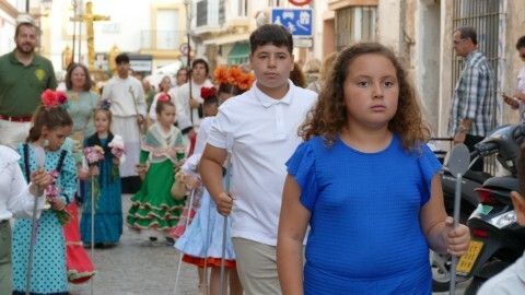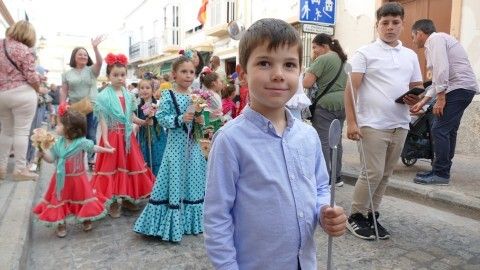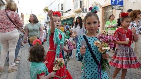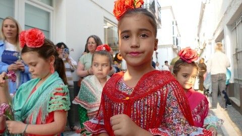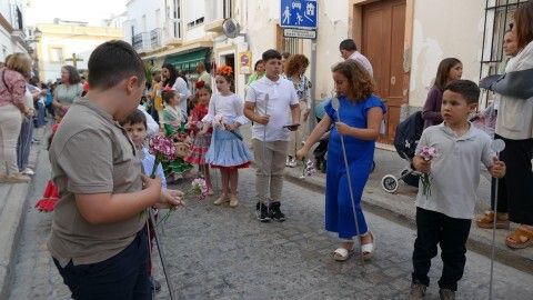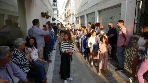 Abrían el cortejo los más pequeños, algunos vestidos de calle y otras de gitana, con flores en las manos o varas y saludando a todo aquel que se fijara en ellos. Le seguía el cuerpo de acólitos precediendo el paso que ha marchado a los acordes musicales que ha tocado la Banda de Cornetas y Tambores de la Asociación Musical Zoilo Ruiz-Mateos.