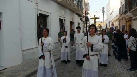 A las ocho de la tarde han partido desde la capilla de la Caridad, con una plaza de Andalucía en la que se podía ver bastante público, movido en parte, por la curiosidad que suscita este paso llevado por niños de entre 8 y 12 años que se toman muy en serio el papel de costaleros. Lo hacían también los capataces Manuel Moreno Heredia y Rodrigo Santamaría Caballero, a los que se unía este año el benjamín Ismael Morales Niño, que han guiado el paso de la gran cruz ornamentada por las calles del casco histórico de Rota.