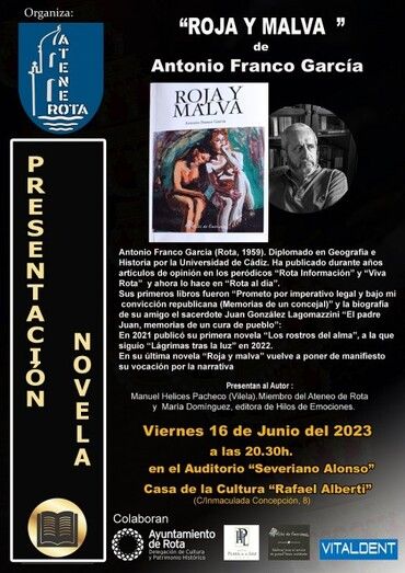 La tercera actividad del mes de junio será el viernes 16, con la presentación de la tercera novela de Antonio Franco, "Roja y Malva", autor al que presentarán Manuel Helices y María Domínguez, editora de Hilos de Emociones. La cita será a las 20.30 horas.