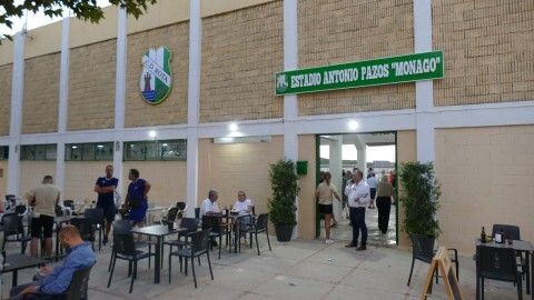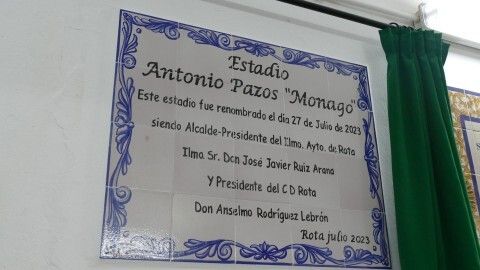 El estadio del CD Rota luce desde este jueves en su fachada el nombre de Antonio Pazos Puyana "Monago", nuevo nombre que sustituye al de "Alcalde Navarro Flores" y que los socios del club verderón han decidido para rendir homenaje eterno a quien fuera su presidente durante 17 años.