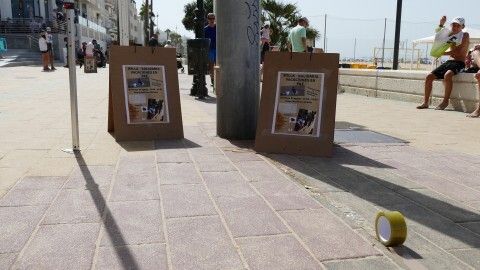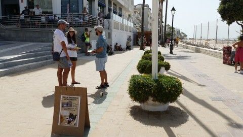 Desde el espigón del hotel Duque de Nájera hasta Virgen del Mar, ha habido voluntarios que han animado a los usuarios de las playas a ser solidarios y aportar en la medida de sus posibilidades una pequeña colaboración económica. El dinero se va colocando en una cinta adhesiva extendida a lo largo del suelo para ir avanzando en esa milla de solidaridad.