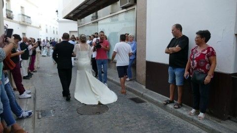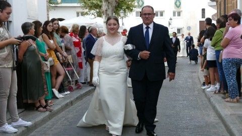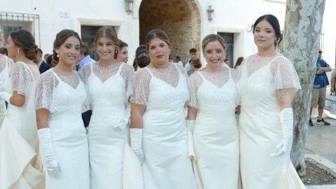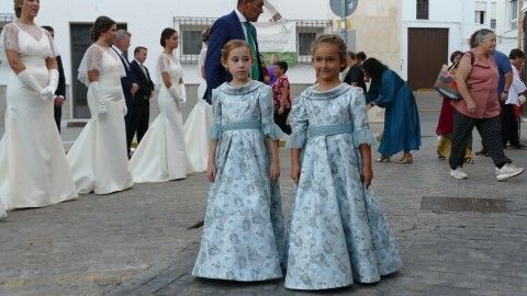 Confeccionados por Mercedes Moreno Rebollo (Merche), este año se ha optado por un modelo sencillo con un vestido de tirantes en tela de raso de novia color marfil, en el que destacaba una capa de pedrería que realzaba este modelo, elegido de entre las propuestas presentadas. Los pajes iban con vestidos y trajes de estilo francés en tonos verde agua.