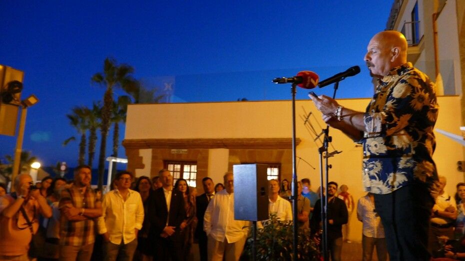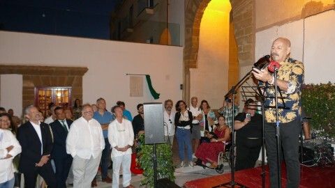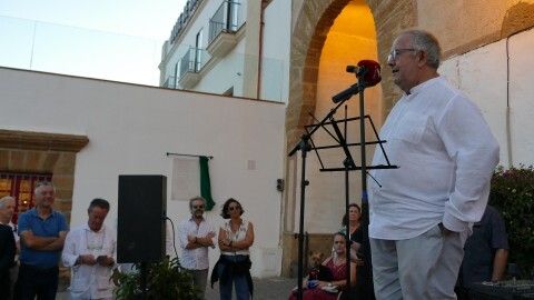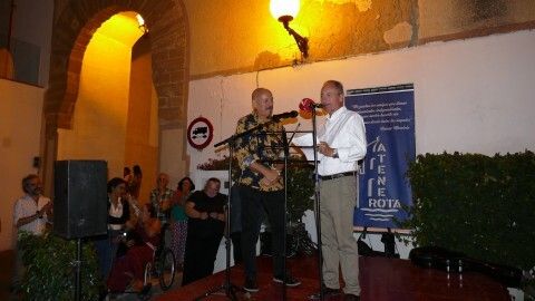 El protagonista de la noche fue quizás el más breve en su intervención, y encima, el levante que soplaba le ahorró el "trance" de tener que llevar a cabo el momento de boato de descubrimiento del azulejo porque la cortinilla verde acabó corriéndose a un lado por el viento. Así que lo suyo fue rápido, dio las gracias al Ateneo de Rota por esta idea para ensalzar la poesía, y recibió con honor una réplica del azulejo que desde hoy corona una esquina de la calle Gravina. Este "músico estribillero" que de momento prefiere que se le siga llamando "cantautor", dio lectura a unos versos que había escrito especialmente para el acto, en el que estuvo arropado por miembros ateneístas, además de gente de la cultura local, el alcalde de Rota, Javier Ruiz, algunos miembros de la Corporación y sus amigos Felipe Benítez y Juan José Téllez.