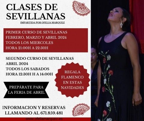 Por otro lado, están las clases de sevillanas para adultos, que comenzará en un primer curso en febrero y se prolongarán hasta abril, todos los miércoles de 21.00 a 22.30 horas; habrá un segundo curso intensivo en abril, todos los sábados de 12.30 a 14.00 horas.