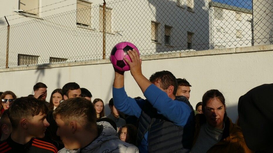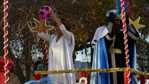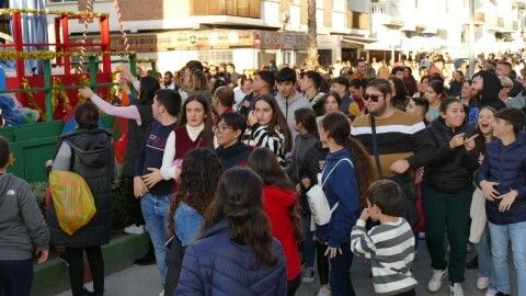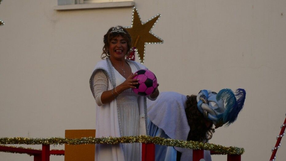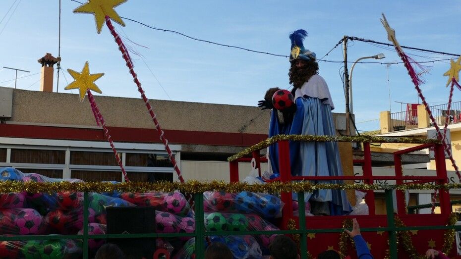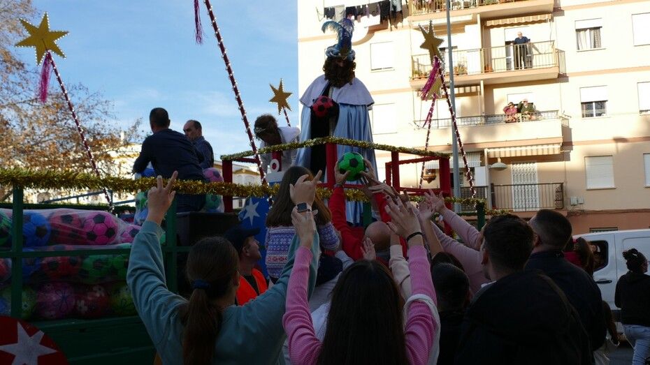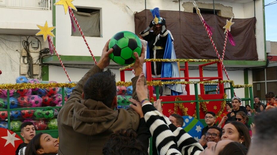 Y es que este año no se han lanzado caramelos sino que el ayudante y la guía de Sus Majestades se han limitado a lanzar exclusivamente balones, lo que ha sido un reclamo total para muchos jóvenes y niños que disfrutan saltando para ver si al final se llevan uno, o más de uno a casa. Eso supone, como es habitual, mucho jaleo y alboroto.