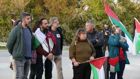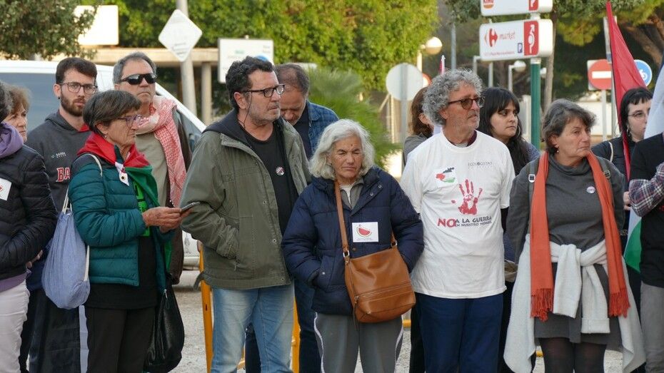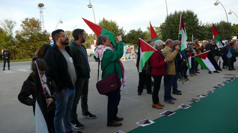 Durante una media hora aproximadamente, en la explanada de aparcamientos cercana al control de la Base Naval de Rota, con banderas y consignas en apoyo al pueblo palestino se ha celebrado esta tarde una concentración de la Plataforma Cádiz con Palestina.