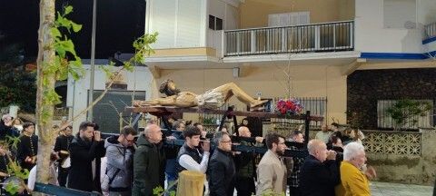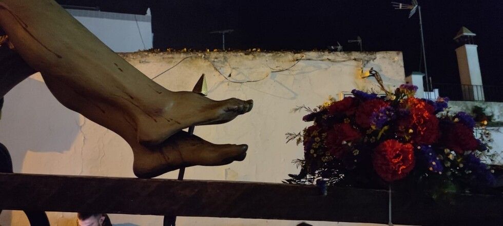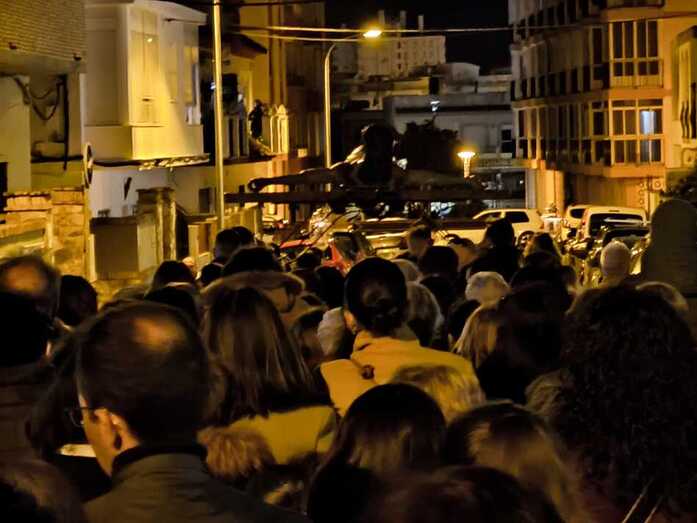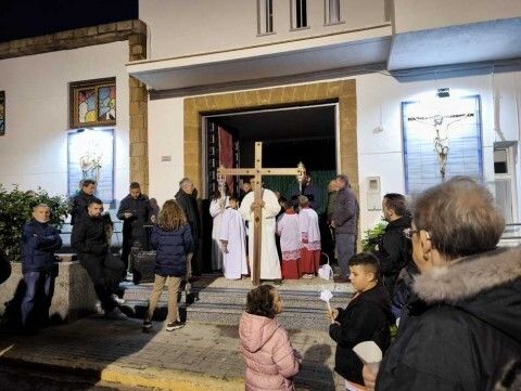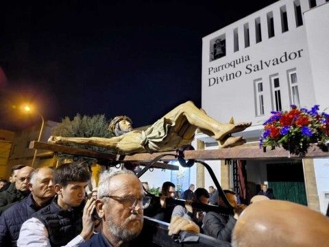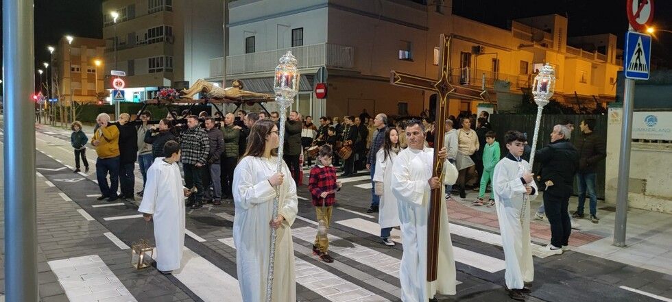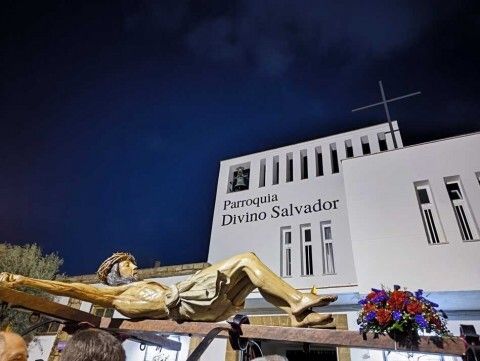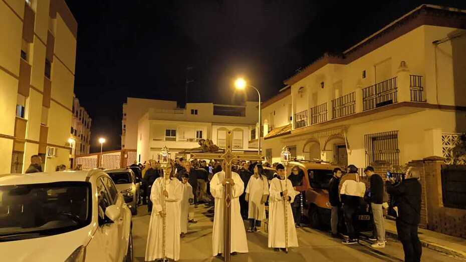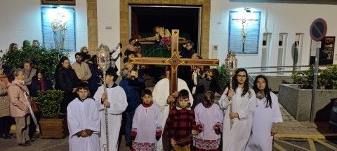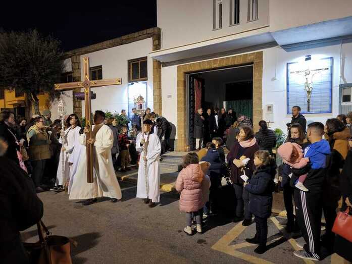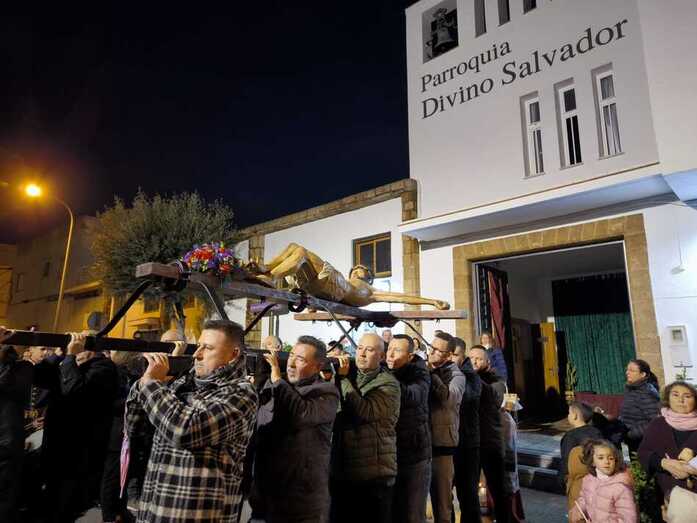 A las 19.45 horas se abrían las puertas de la iglesia del Salvador y una cruz parroquial donada por un feligrés de la parroquia acompañada de un par de faroles cedidos por la hermandad del Nazareno para la ocasión, iniciaban el recorrido por las calles cercanas al barrio en el que está situado este templo.