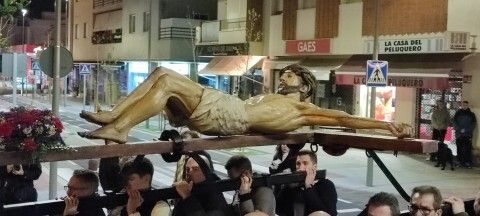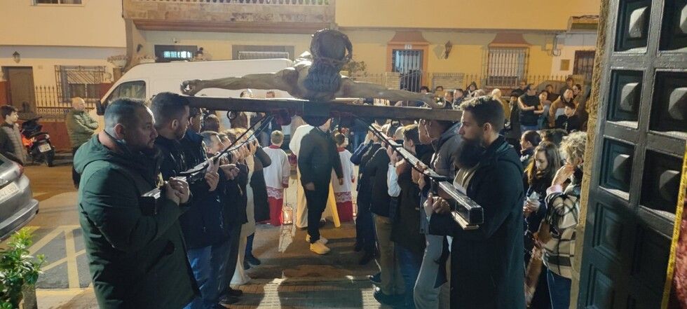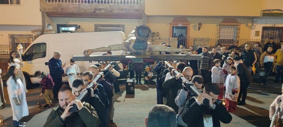 La imagen del Santísimo Cristo de la Salvación,que normalmente preside el altar mayor y que baja de su lugar habitual para este acto litúrgico, ha estado cargado por feligreses.