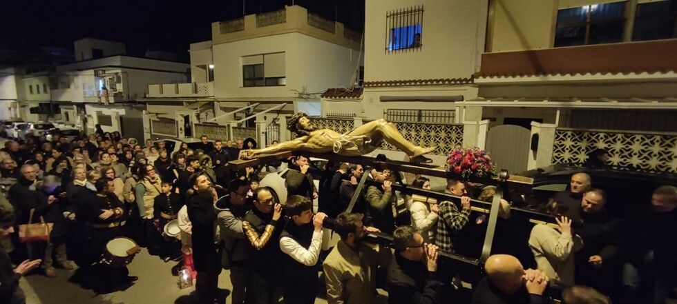 Pese a la inestabilidad del tiempo a lo largo de toda la jornada del sábado, la feligresía de la parroquia del Divino Salvador ha acompañado esta tarde a la imagen del Santísimo Cristo de la Salvación, que ha presidido el viacrucis de Cuaresma organizado por la comunidad de esta iglesia de Rota.