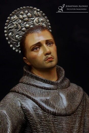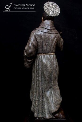 La imagen según su iconografía, representa a un joven fraile franciscano con poca barba, vestido con su capucha de color marrón, recreando una trama con tonos grisáceos, tomando referencias de los ropajes que realizaba el escultor imaginero Pedro de Mena, con un rosario y un cíngulo de color blanco en su cintura. En su mano derecha porta un crucifijo de madera y en el delantal de su hábito, se representa el milagro de los panecillos que el santo llevaba a los pobres y que se convirtieron en rosas. Por otro lado, se puede observar hojas de encina y las bellotas, en referencia a las encinas que hay cerca de la ermita de las cuales se dicen que las bellotas tienen una marca en forma de corazón.