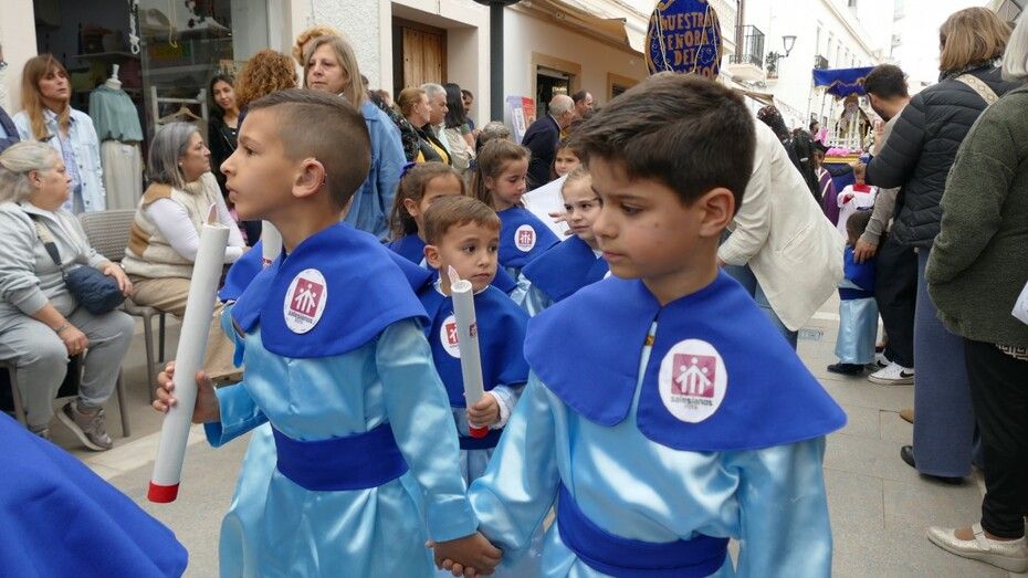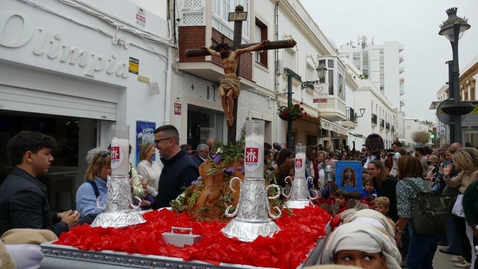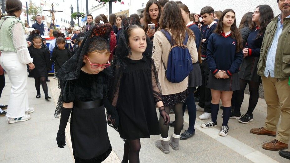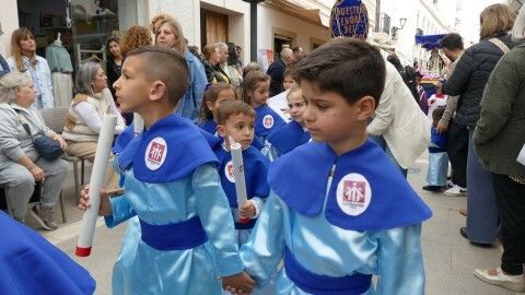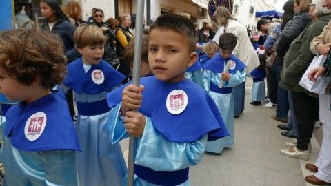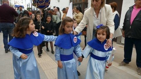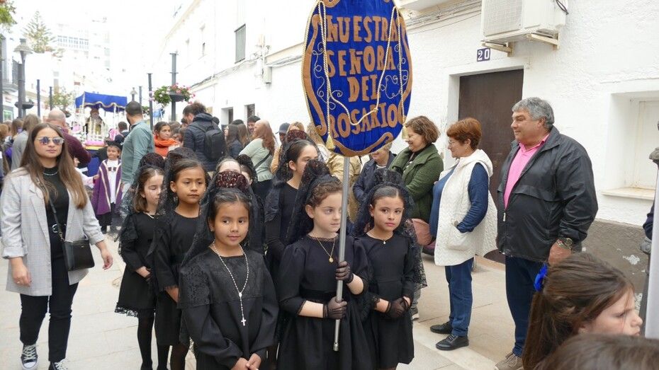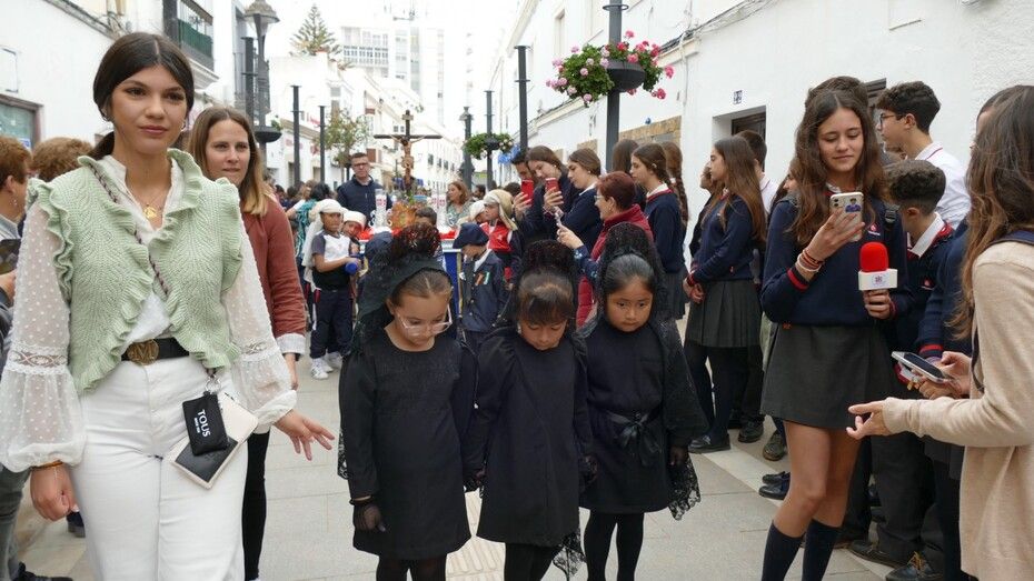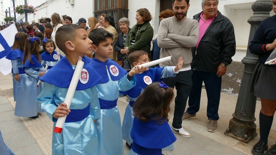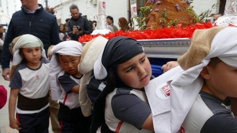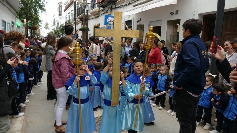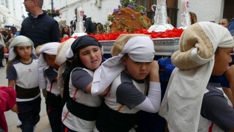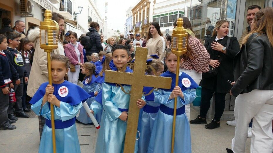 Partiendo este año desde la capilla de San Roque, ya que las obras de la avenida María Auxiliadora en el tramo que afecta a la entrada de los Salesianos aún no han terminado, ha iniciado su recorrido esta salida procesional en la que hay niñas de mantilla, hermanos con túnicas, unos alborotados músicos y hasta un obispo. Sin duda, cada año dejan una estampa muy divertida en la recreación de una procesión que es antesala de todas las que se podrán disfrutar en la localidad desde el Domingo de Ramos al Domingo de Resurrección. Especial atención llaman los costaleros que hacen el esfuerzo de cargar los dos pasos que sacan a la calle, con un Cristo en la cruz y una dolorosa bajo palio.
