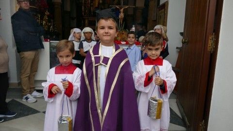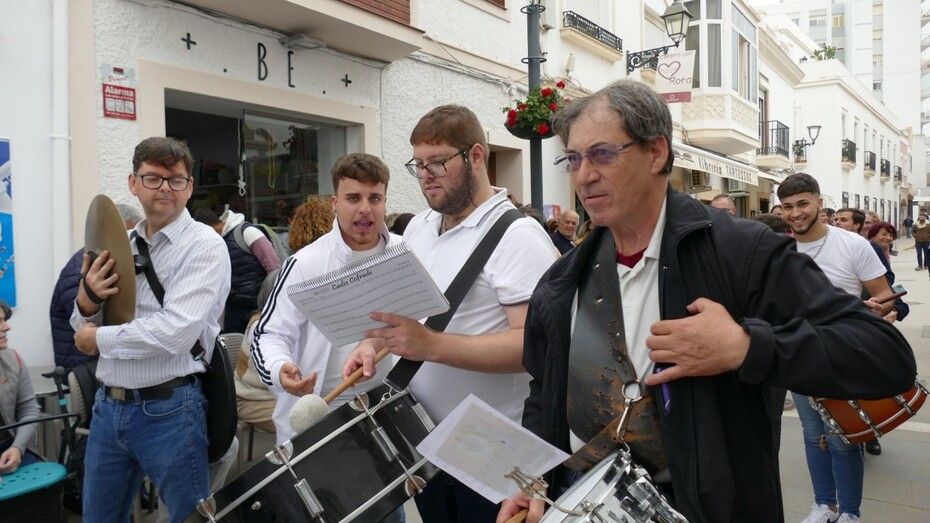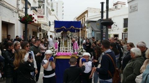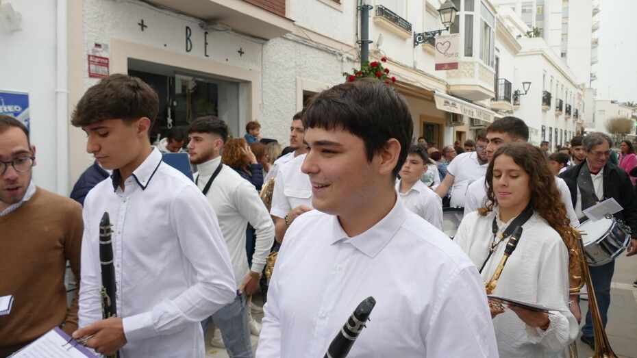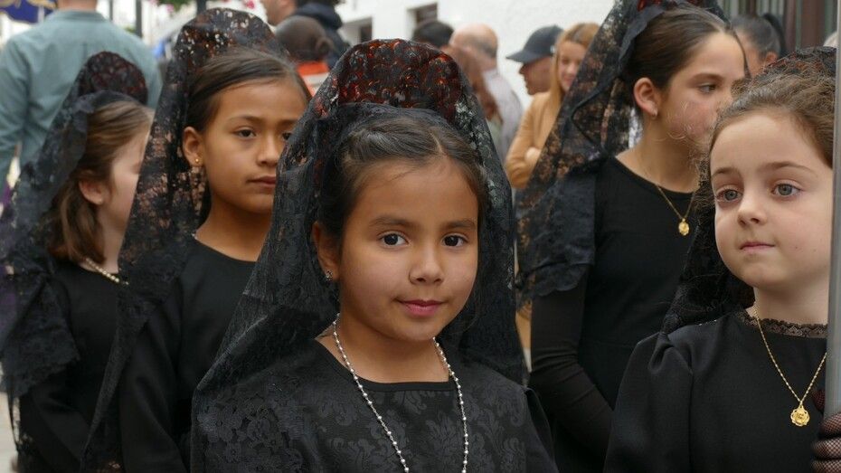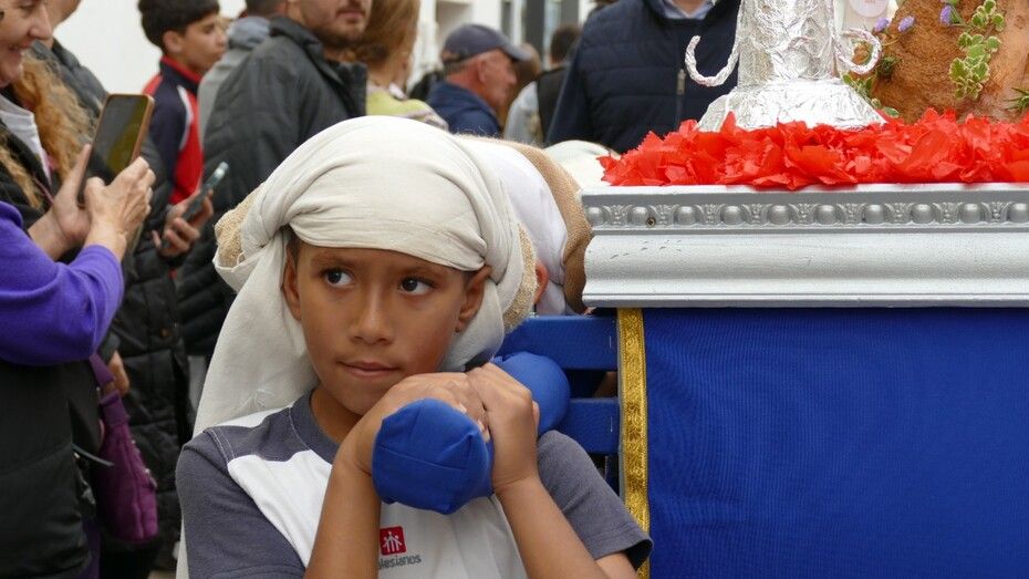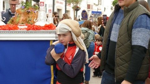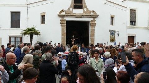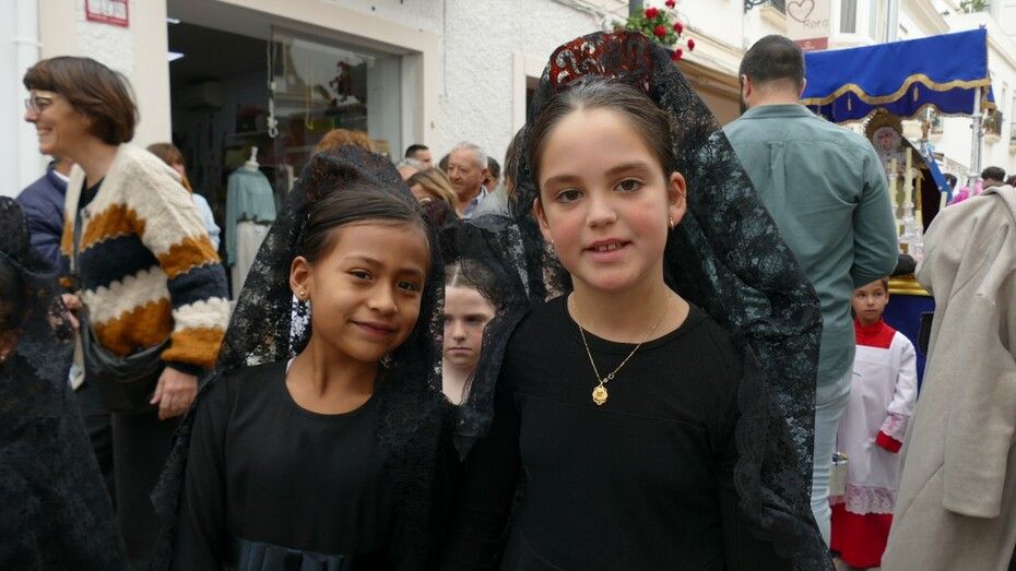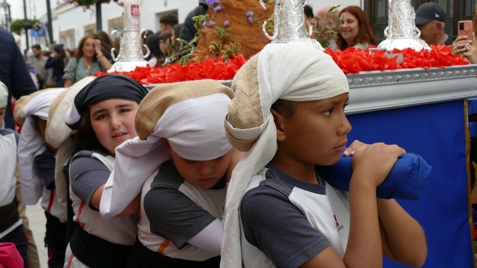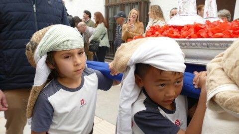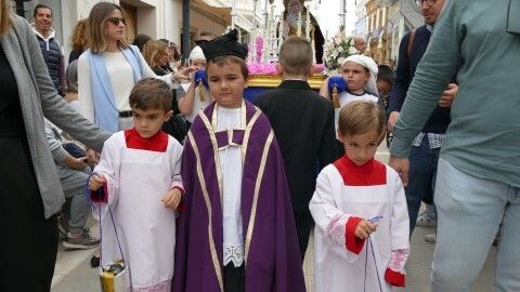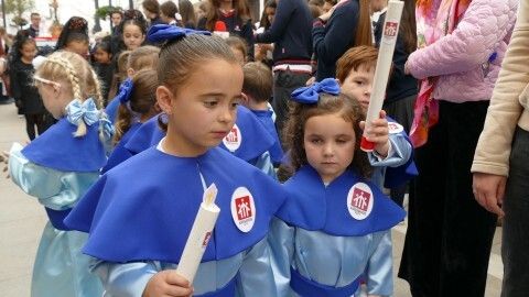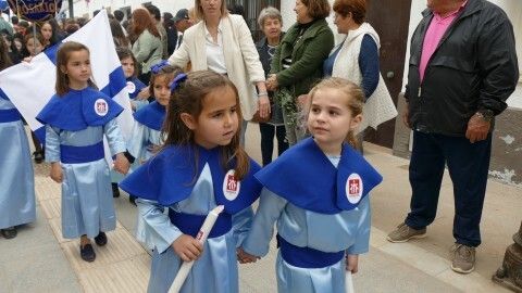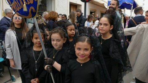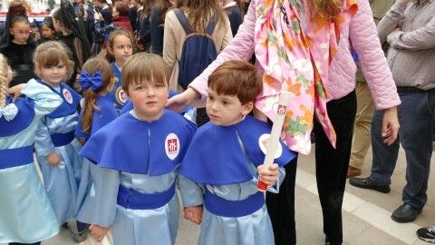 Partiendo este año desde la capilla de San Roque, ya que las obras de la avenida María Auxiliadora en el tramo que afecta a la entrada de los Salesianos aún no han terminado, ha iniciado su recorrido esta salida procesional en la que hay niñas de mantilla, hermanos con túnicas, unos alborotados músicos y hasta un obispo. Sin duda, cada año dejan una estampa muy divertida en la recreación de una procesión que es antesala de todas las que se podrán disfrutar en la localidad desde el Domingo de Ramos al Domingo de Resurrección. Especial atención llaman los costaleros que hacen el esfuerzo de cargar los dos pasos que sacan a la calle, con un Cristo en la cruz y una dolorosa bajo palio.