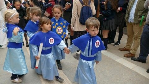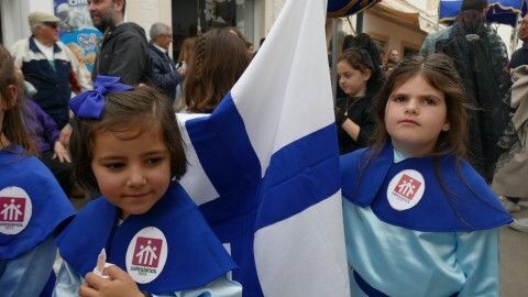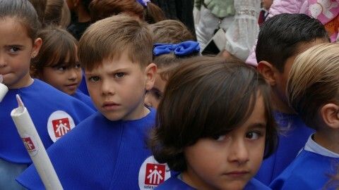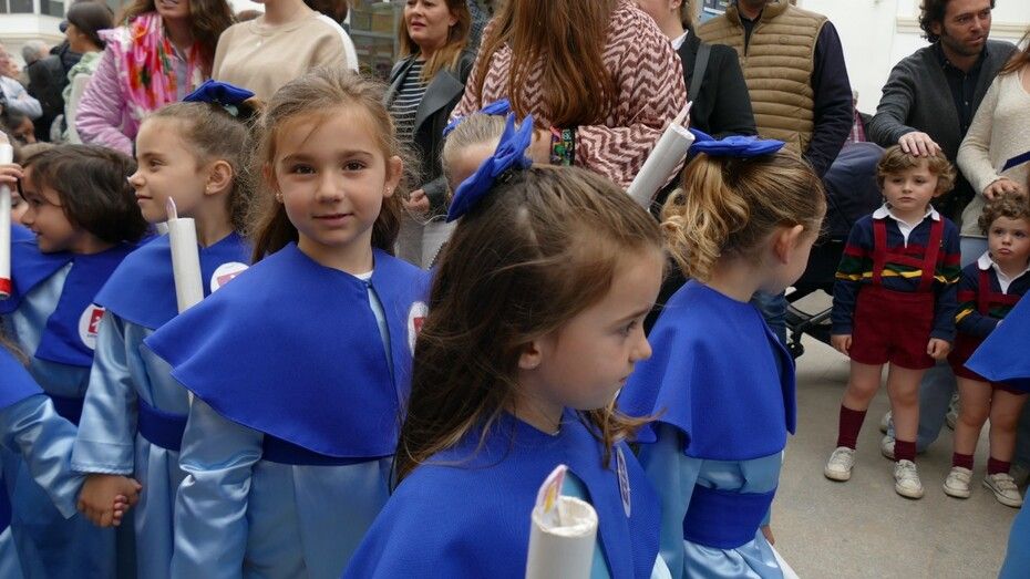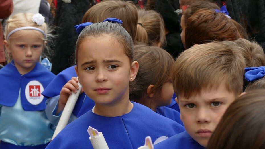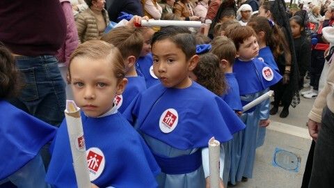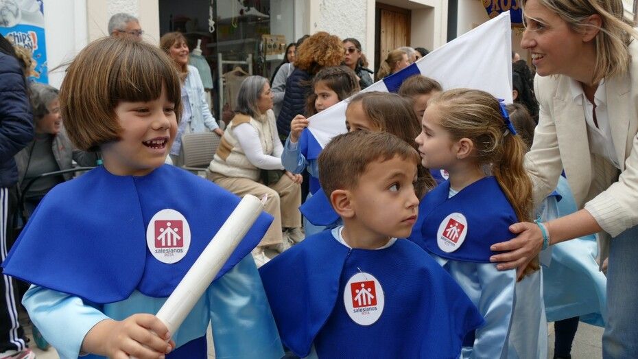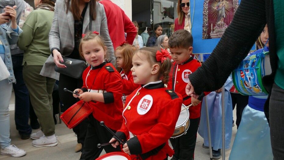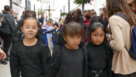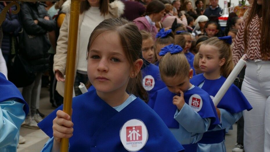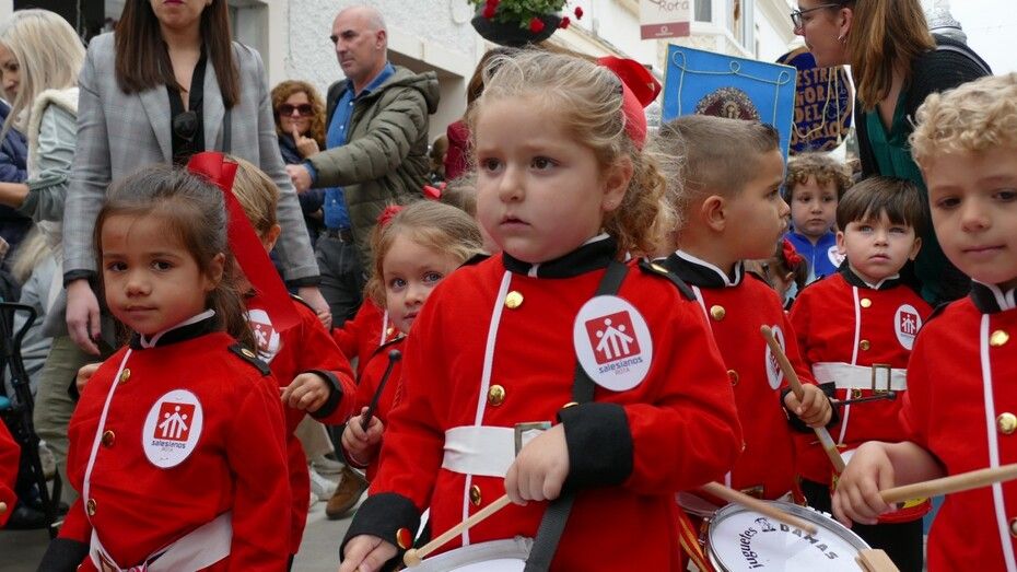 La mañana tranquila del Viernes de Dolores se rompe cada año con la salida de la procesión que organiza el colegio Salesianos de Rota y que alborota las calles del centro con un cortejo difícil de mantener en orden pero atractivo por la edad de quienes lo componen. Y es que este centro educativo, que ya es un clásico en este día previo a la Semana Santa, involucra a toda la comunidad educativa en esta actividad ya que aunque en el cortejo solo estén representados los alumnos de Infantil y 1º y 2º de Primaria, el resto de estudiantes salen a la calle para acompañarlos. A ellos se suman familias y vecinos que disfrutan con la puesta en escena que completan los músicos de varias bandas locales y ex alumnos salesianos, que aportan su granito de arena con la música en directo, dando mayor realce a la procesión.