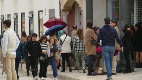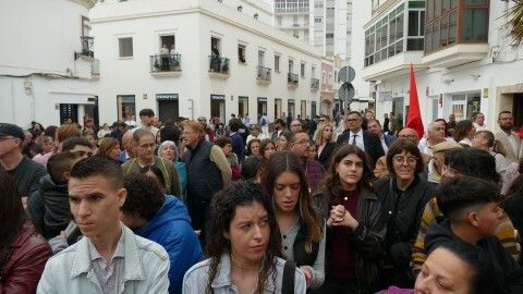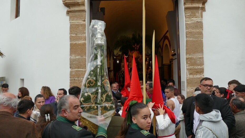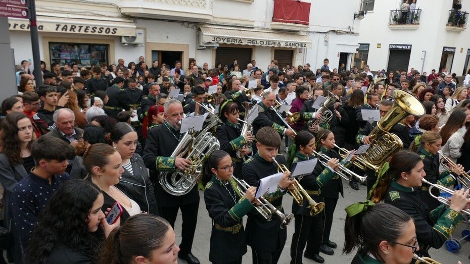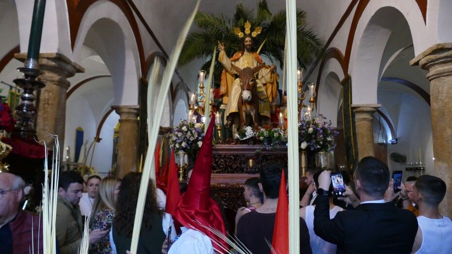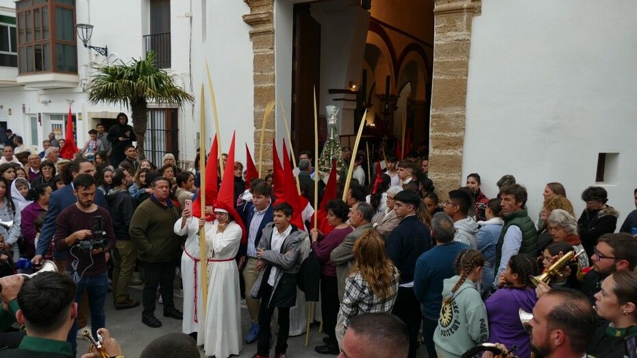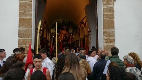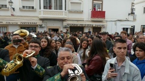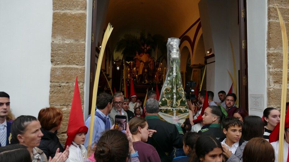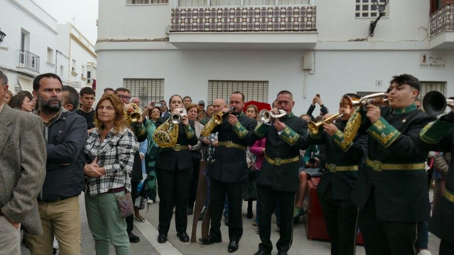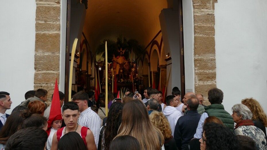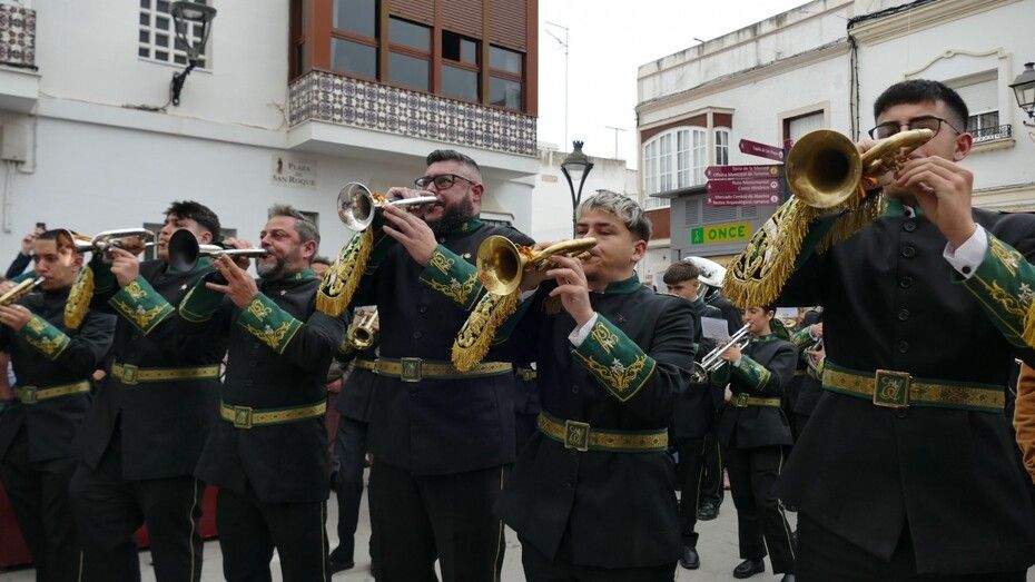 Tras rezar a puerta cerrada con los hermanos, la capilla de San Roque se abría y se dejaban ver algunos penitentes con cara triste, alguna lágrima y resignación. En ese momento, la Banda de Cornetas y Tambores 'Entre Azahares', de Dos Hermanas (Sevilla), que iba a acompañar a La Borriquita en su salida del Domingo de Ramos, le ha dedicado tres marchas que se han podido escuchar sin que cayeran apenas gotas. Un gesto aplaudido por el público presente que todavía llenaba la plaza y que poco a poco, se ha ido quedando vacía y la lluvia ha comenzado a apretar. La capilla de San Roque ha permanecido abierta algo más de una hora para que los ciudadanos que quisieran pudieran ver el paso. Han sido muchos los que han entrado para verlo, vestido por Fran Pacheco, vestidor del conjunto escultórico que hoy presentaba a Jesús de la Paz de rey, y no de hebreo como el año pasado.