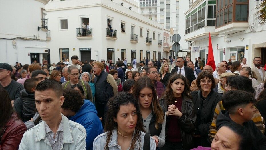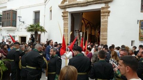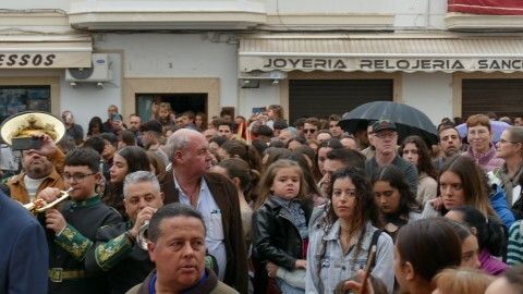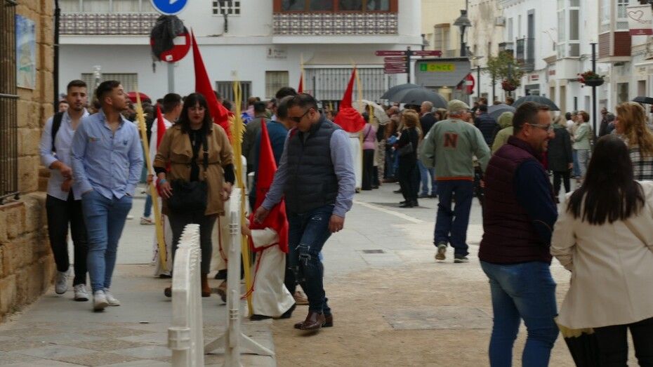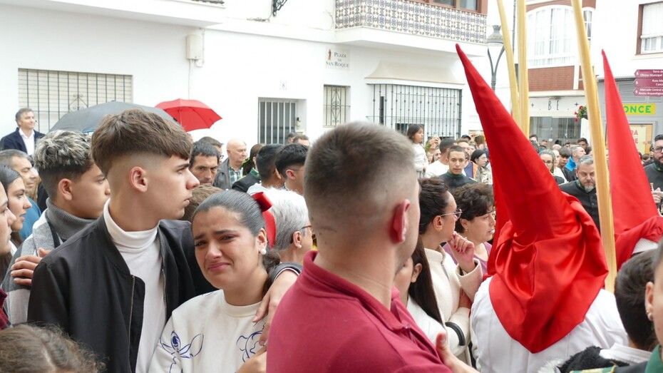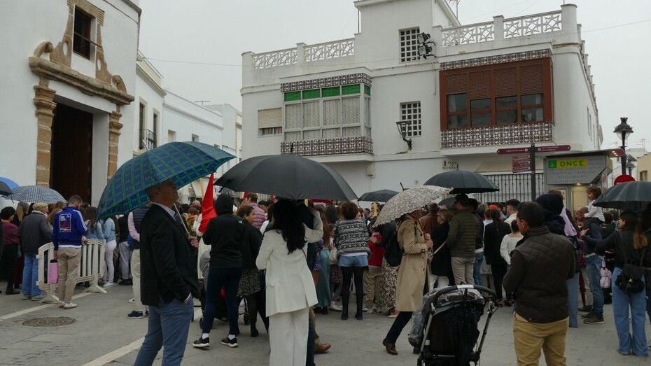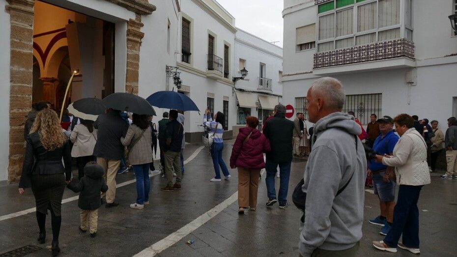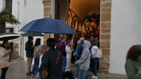A las cinco de la tarde, 45 minutos antes de la hora señalada, la junta de gobierno tomaba la complicada decisión que a veces resulta decir a los hermanos que se quedan en capilla, pero no había mucho margen de maniobra. La amenaza de lluvia empezaba a ser realidad por algunas zonas de Rota y era cuestión de pocos minutos que se dejara notar en el centro. Pese a todo, en la plaza de San Roque había congregados muchos ciudadanos, algunos ya con paraguas abiertos, y con la esperanza de que un giro de última hora permitiera que la cruz de guía que abre el cortejo, saliera por el dintel de la capilla de San Roque. Pero no ha podido ser.