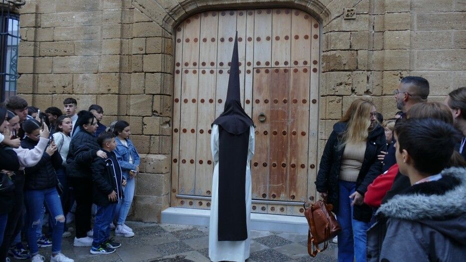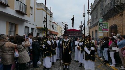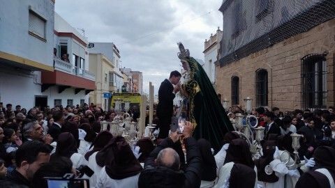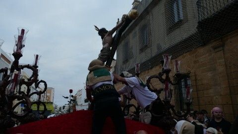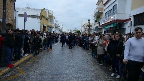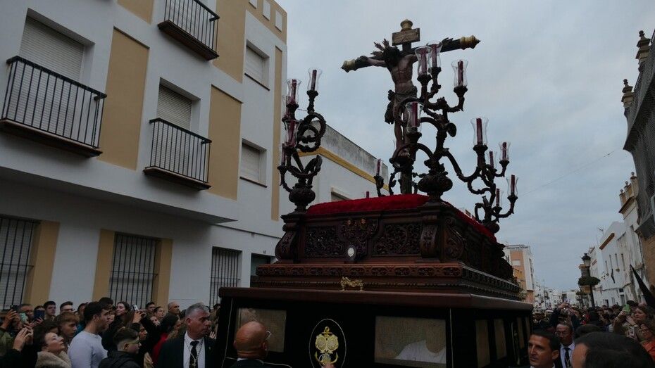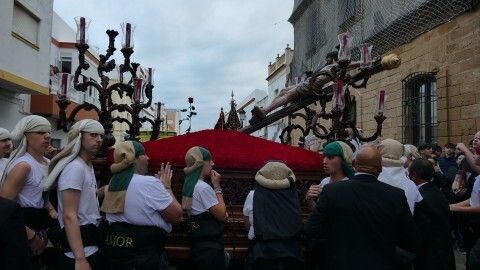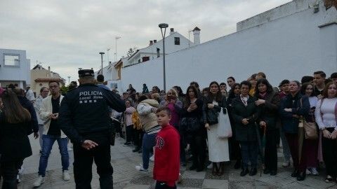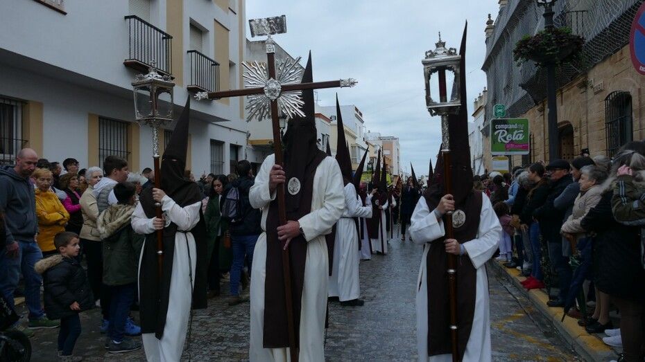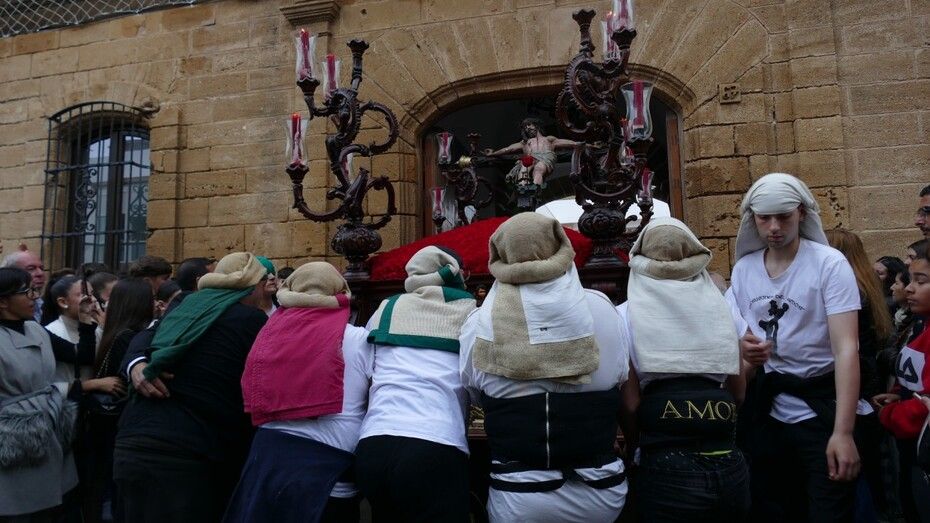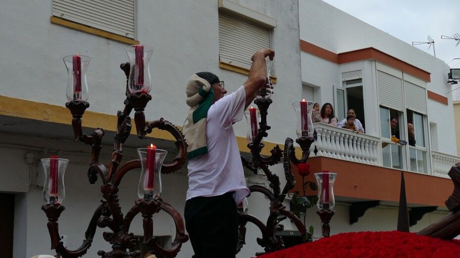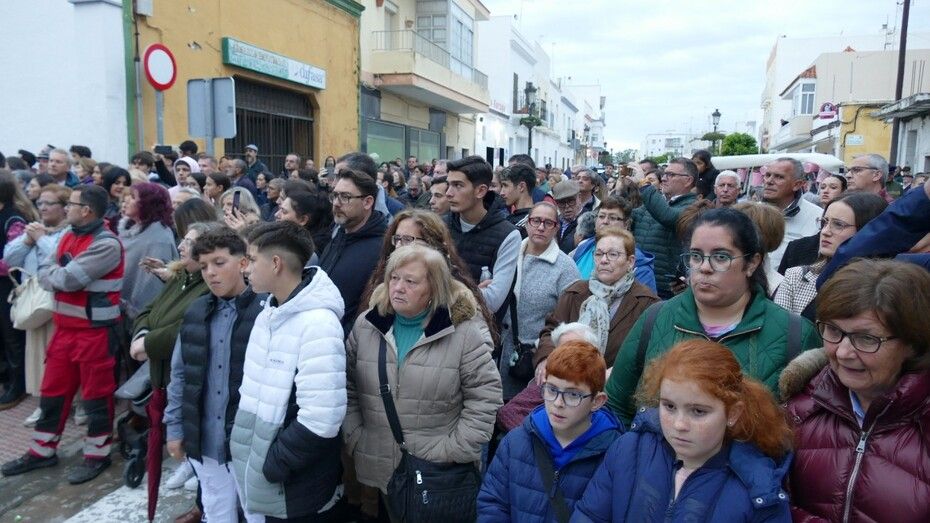 Como cada año, dadas las dimensiones de la puerta de la parroquia del Carmen, los pasos tienen que salir prácticamente desmontados. En el caso del Cristo del Amor lo hace tumbado y en esta ocasión, sin las potencias que iba estrenando y que se le han colocado una vez en la calle. En total, unos 20 minutos, a los que ha habido que sumar otros 20 para poder ver a la virgen salir, con el paso igualmente a medio montar, y sin la corona de plata, cedida por la Hermandad del Nazareno de Rota, que se le ha colocado una vez fuera. Por lo tanto, la salida hasta que el cortejo ha echado a andar, ha durado una hora prácticamente, que muchos roteños y visitantes han esperado pacientemente llenando las calles.