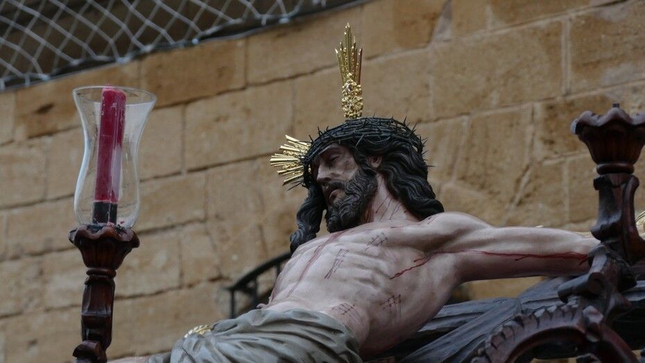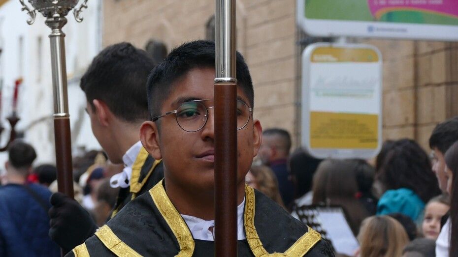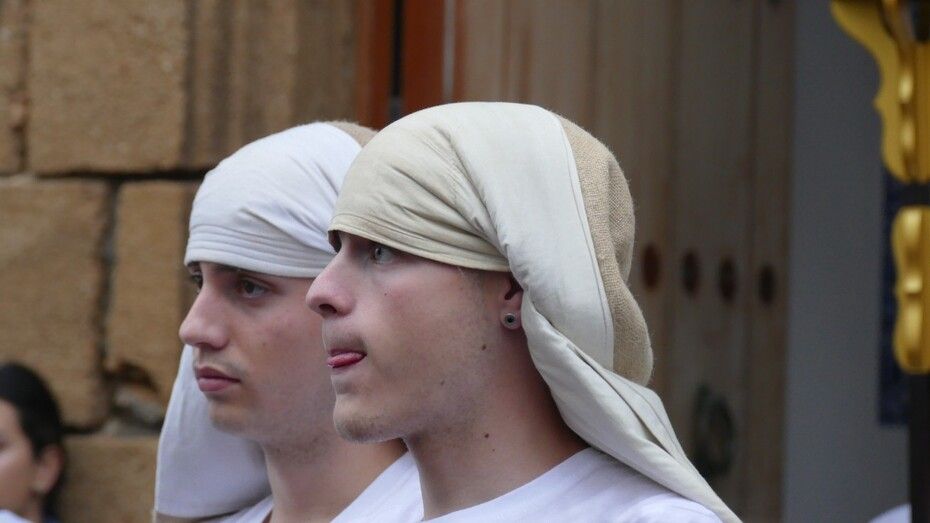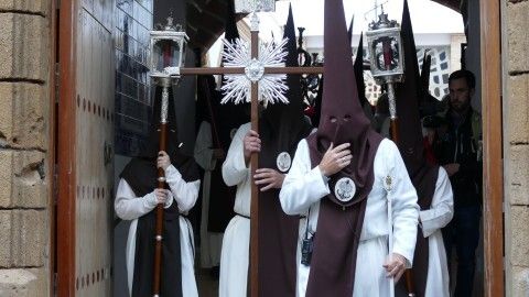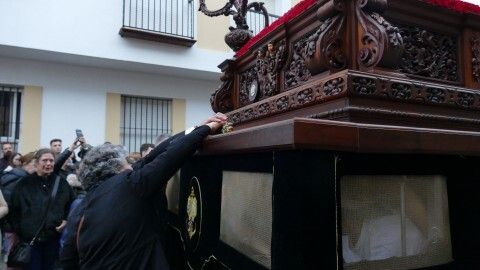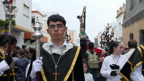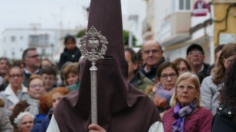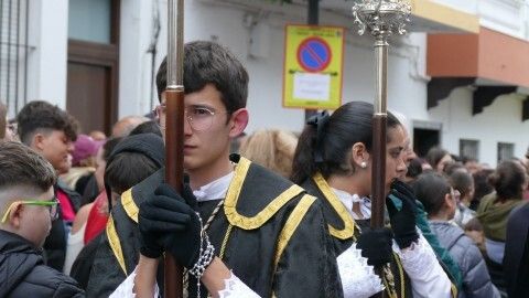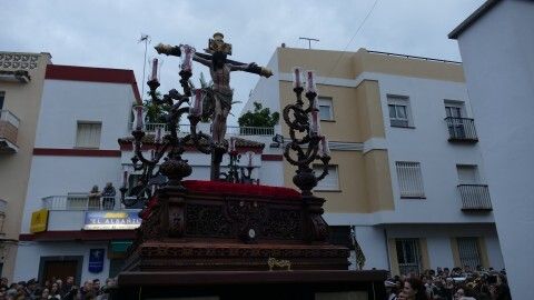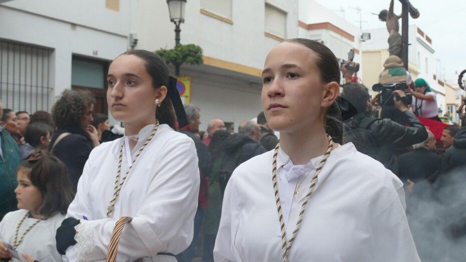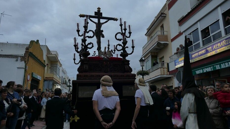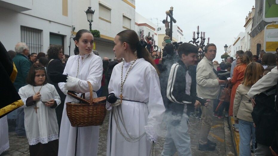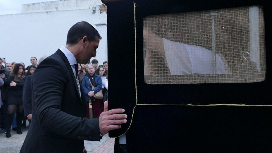 Como cada año, dadas las dimensiones de la puerta de la parroquia del Carmen, los pasos tienen que salir prácticamente desmontados. En el caso del Cristo del Amor lo hace tumbado y en esta ocasión, sin las potencias que iba estrenando y que se le han colocado una vez en la calle. En total, unos 20 minutos, a los que ha habido que sumar otros 20 para poder ver a la virgen salir, con el paso igualmente a medio montar, y sin la corona de plata, cedida por la Hermandad del Nazareno de Rota, que se le ha colocado una vez fuera. Por lo tanto, la salida hasta que el cortejo ha echado a andar, ha durado una hora prácticamente, que muchos roteños y visitantes han esperado pacientemente llenando las calles.