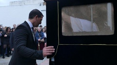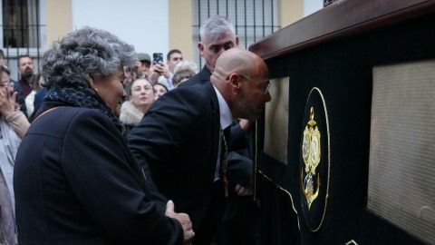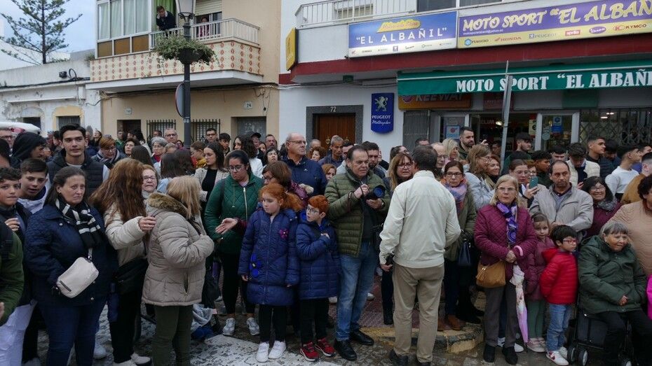 Mientras la hermandad decidía en el interior de la parroquia de Nuestra Señora del Carmen qué hacer, los roteños se habían ido agolpando en la calle Calvario deseando que las puertas se abrieran, pero tuvieron que esperar desde las seis, hora prevista, hasta que finalmente, a las siete, y con aplausos incluidos, el diputado mayor llamaba a la puerta y por fin, se veía la cruz de guía por el dintel.