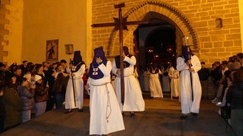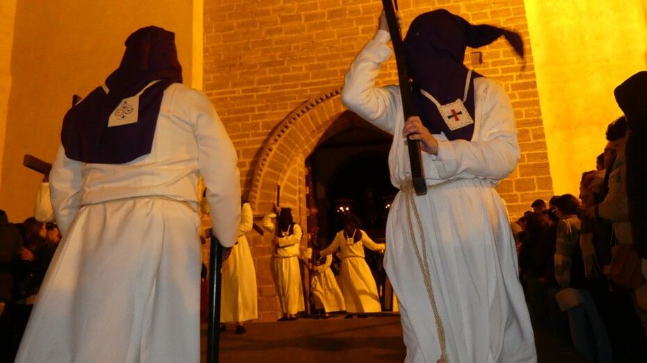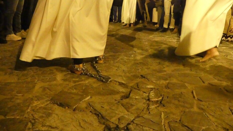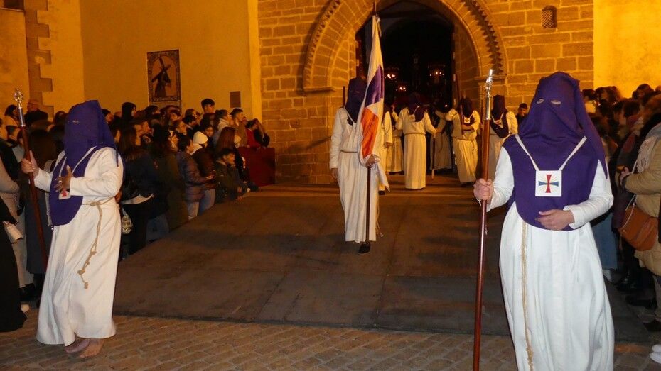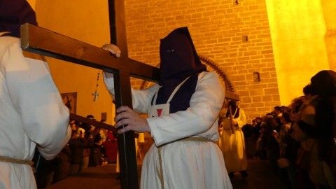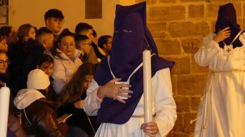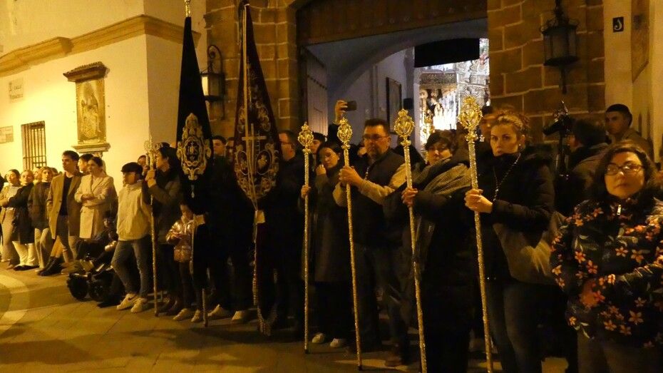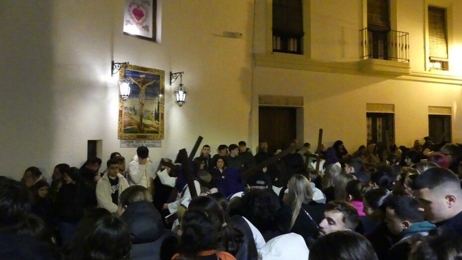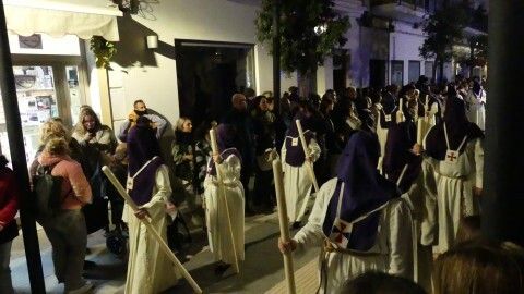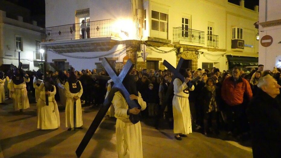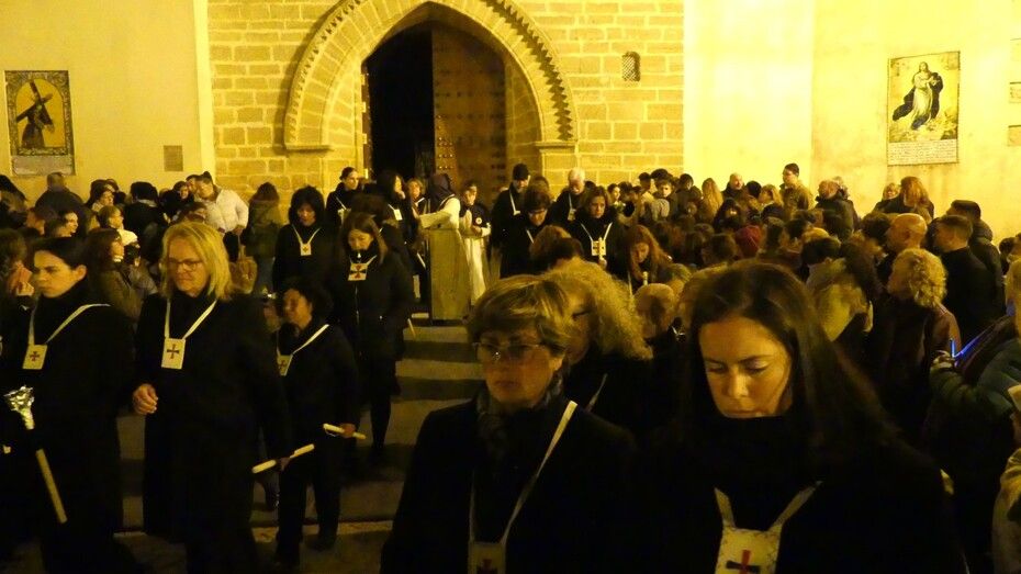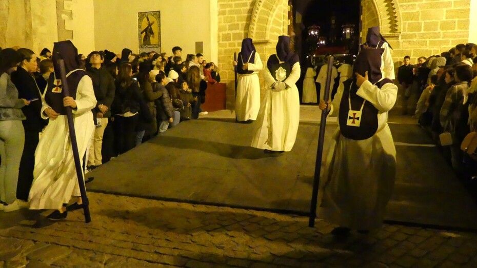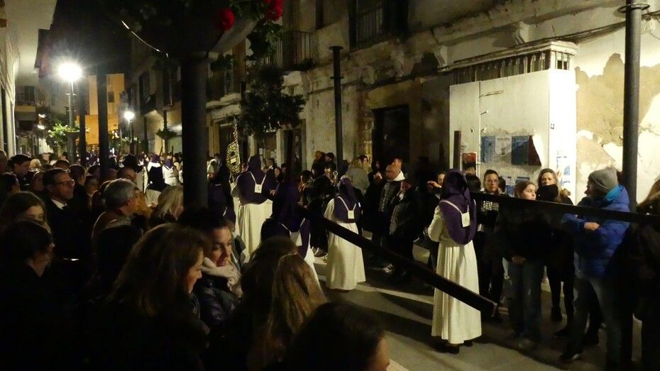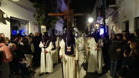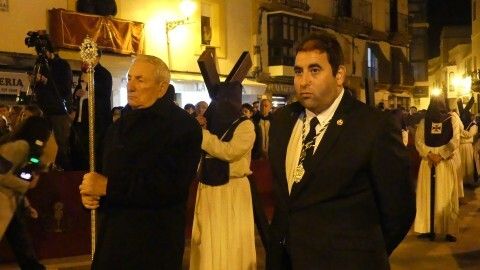 Hermanos con cirios, portando pesadas cruces, hermanas de vela, pies descalzos y algunos con cadenas, además de las insignias propias de la hermandad, formaron el cortejo que este año, era algo más largo que el año pasado, con más de 300 personas incluyendo a los costaleros que esta Semana Santa estrenaban como guía al nuevo capataz, Manuel Niño Margarito.
