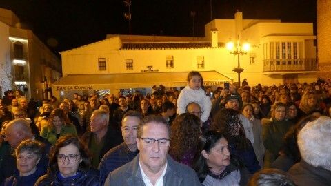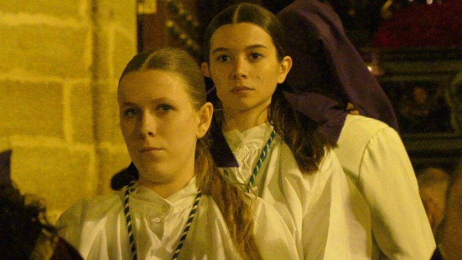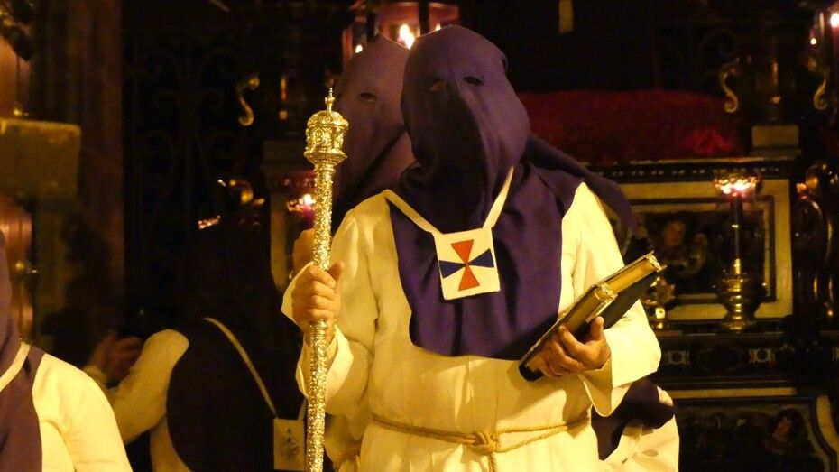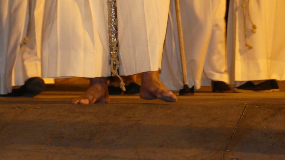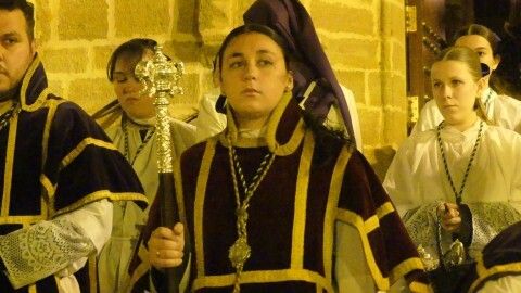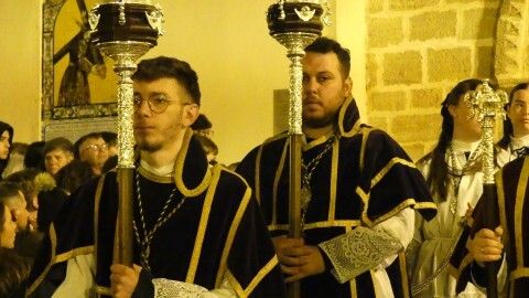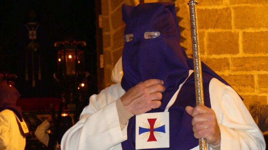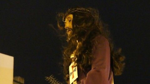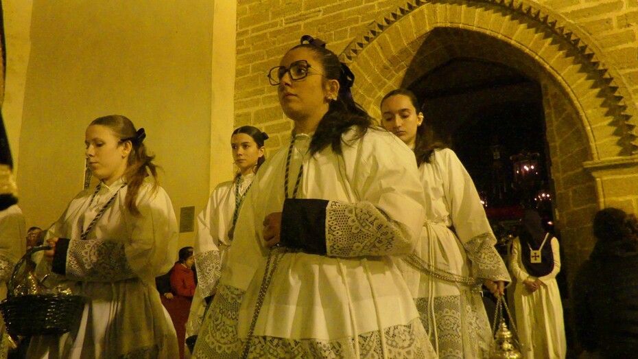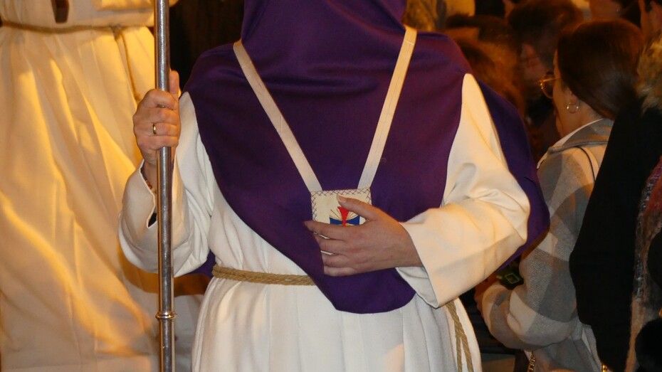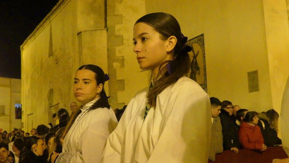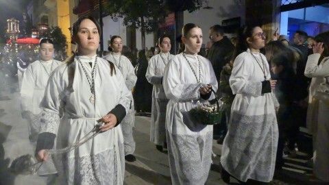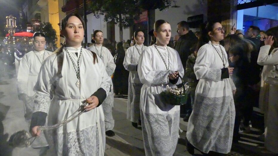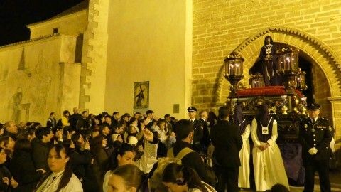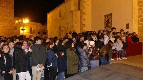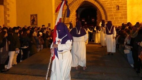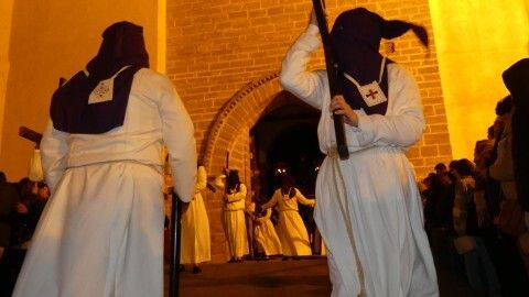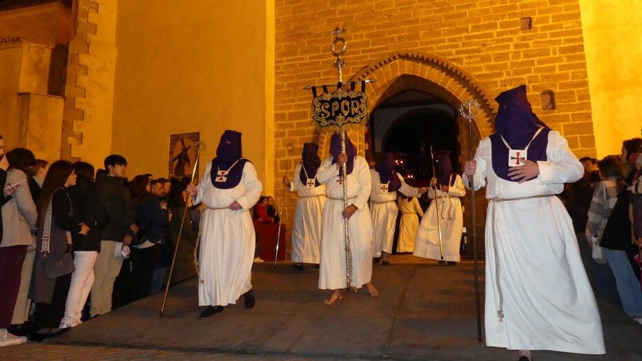 Hermanos con cirios, portando pesadas cruces, hermanas de vela, pies descalzos y algunos con cadenas, además de las insignias propias de la hermandad, formaron el cortejo que este año, era algo más largo que el año pasado, con más de 300 personas incluyendo a los costaleros que esta Semana Santa estrenaban como guía al nuevo capataz, Manuel Niño Margarito.