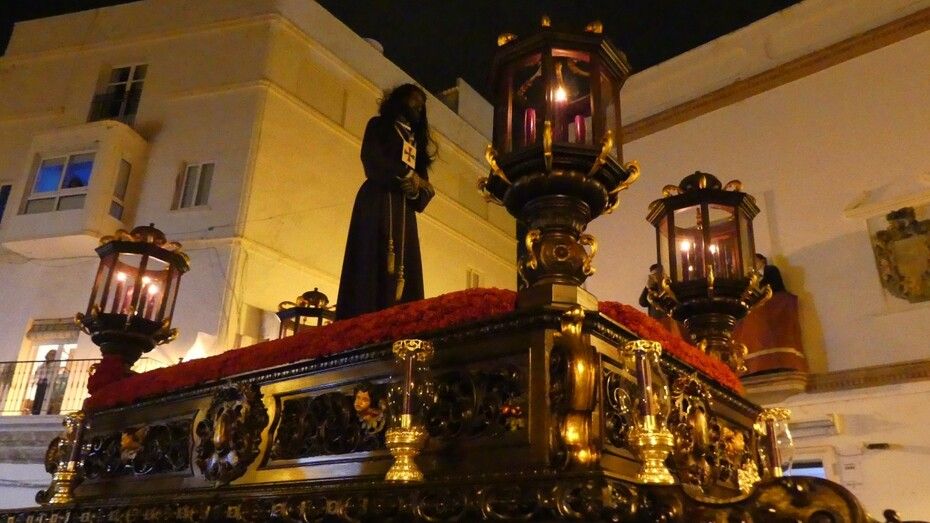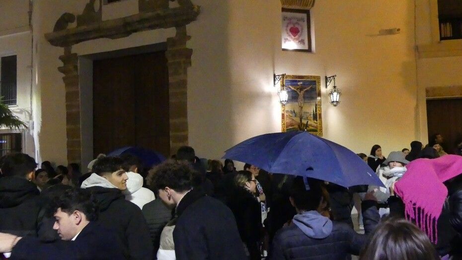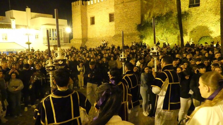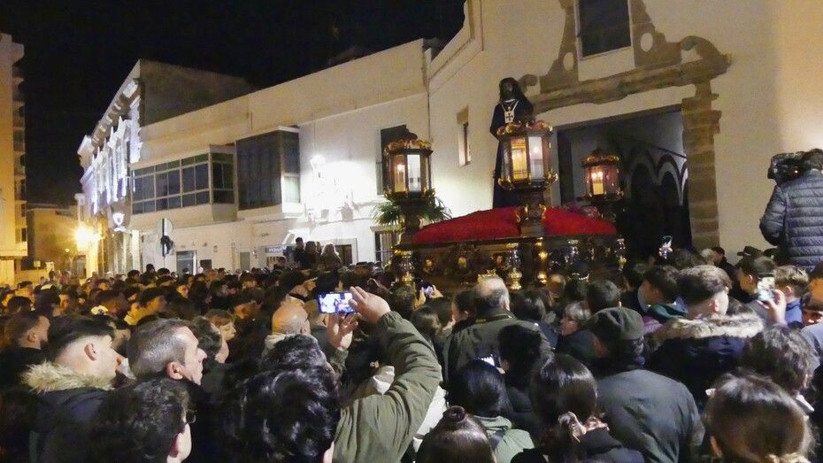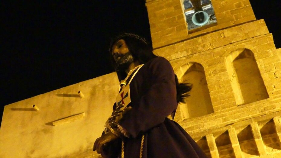 Ha sido una estación de penitencia truncada por la inestabilidad meteorológica pero que a muchos roteños, les ha confortado. De hecho, pese a la fría noche, las calles han estado llenas desde el principio para pver a este Jesús coronado de espinas y maniatado, con túnica de sarga morada y pisando el tradicional monte de claveles rojos.