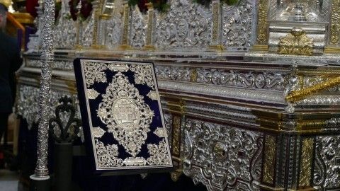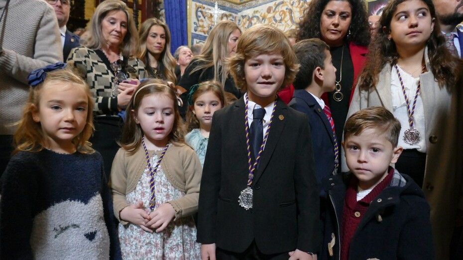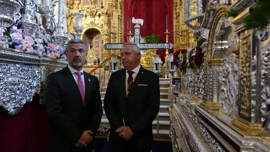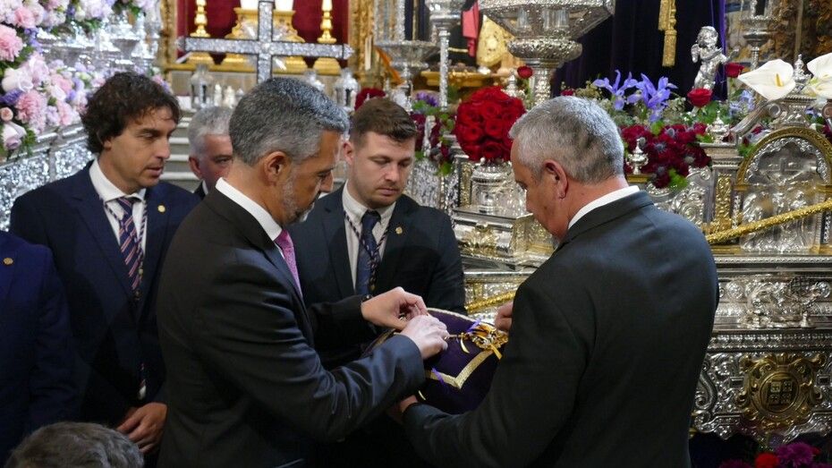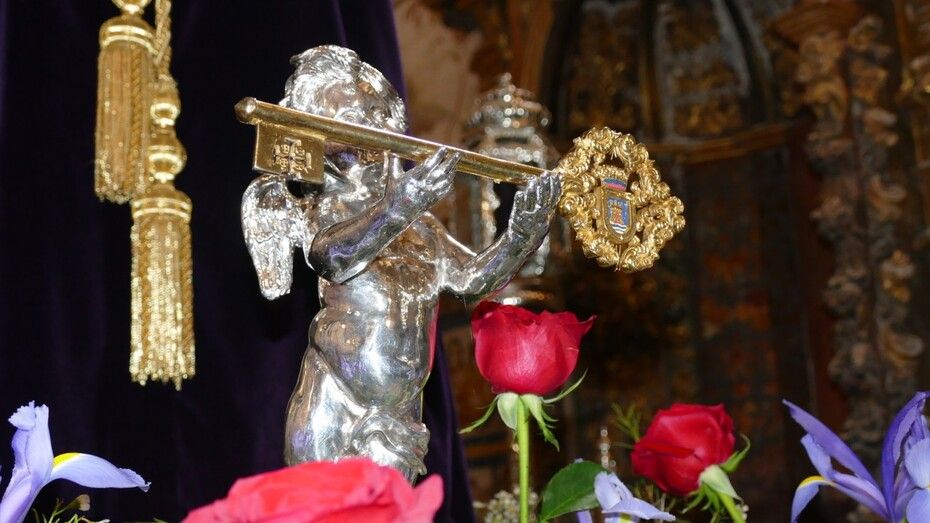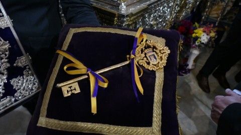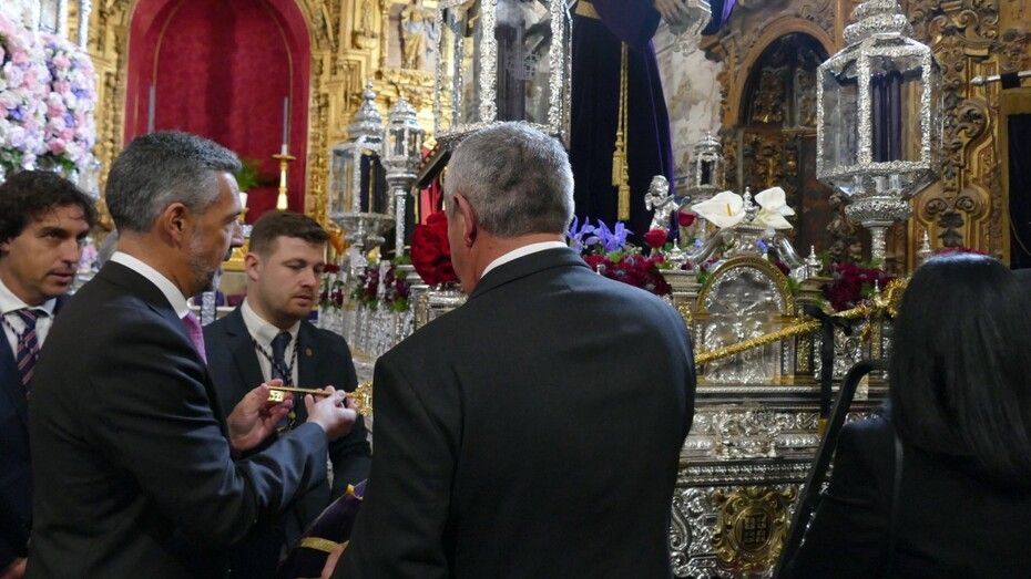 Javier Ruiz Arana ha colocado la Llave de la Ciudad sobre las manos de un angelito que se sitúa a los pies de Jesús que, al igual que María Santísima de la Amargura, ya está preparado en su paso para realizar su estación de penitencia.