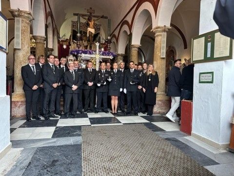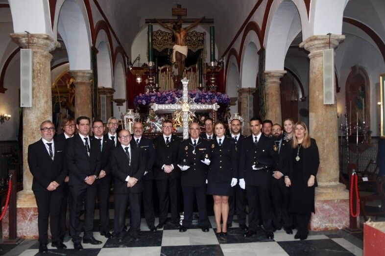 Con motivo del 200 aniversario de su fundación que celebra la Policía Nacional, el presidente de esta asociación compuesta por funcionarios del cuerpo de seguridad, José Manuel Barba, acompañado de los agentes nacionales que esta tarde escoltarán a los pasos del Cristo y la virgen, han entregado un ramo de flores al hermano mayor, Jesús Alegre.