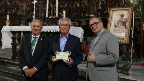 Además de la presentación del cartel de la romería de San Isidro, la hermandad ha tenido hoy un detalle con los hermanos que cumplen 50 años como miembros de ella, entregándoles un reconocimiento en señal de agradecimiento. Este año han cumplido bodas de oro como hermanos, Juan Cutilla Merino, Ricardo Cutilla Merino, Antonio Cutilla Merino, Juan Salas Macías, Abelardo González Bernal (recogido por u hijo José Manuel González), y Manuel Benítez Reyes. Han sido el hermano mayor y el asistente eclesiástico de la hermandad, el párroco José Arjona Gil, los encargados de entregarlos junto a otros miembros de la junta.
