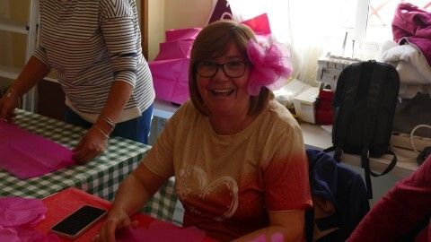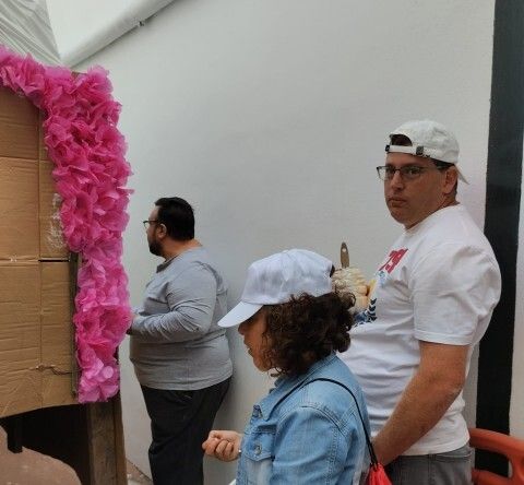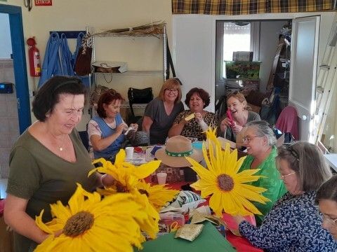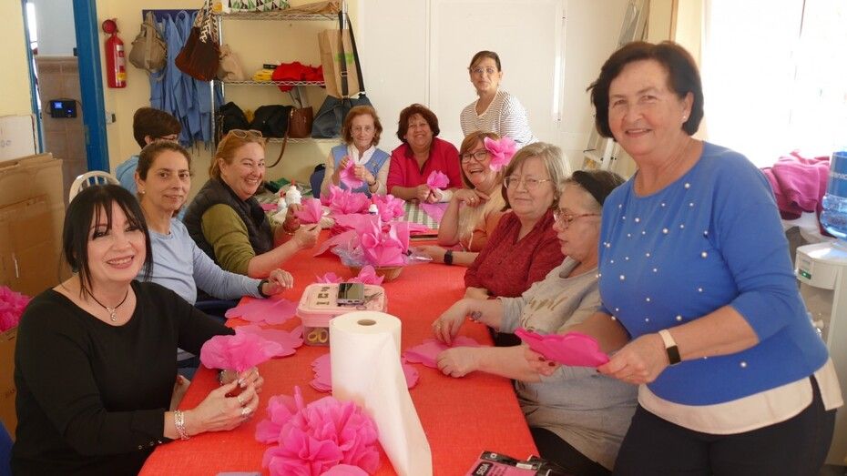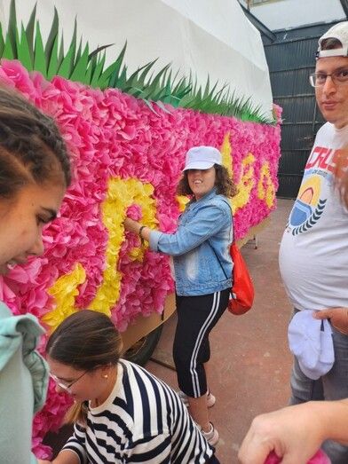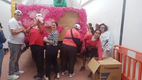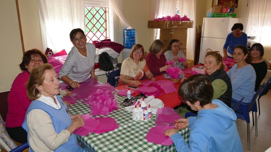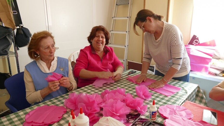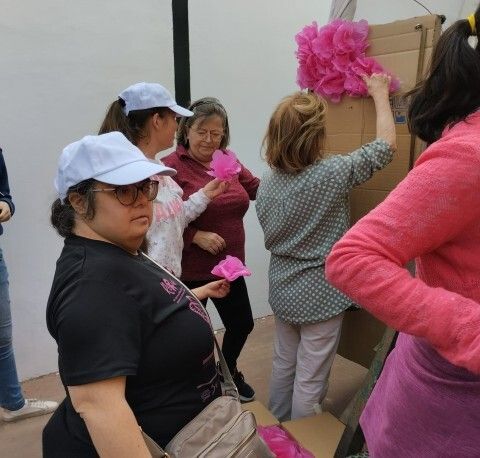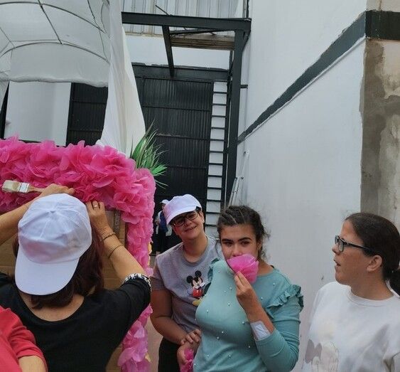 Desde hace varias semanas, las madres de los chicos de la asociación y algunos padres, junto a los propios usuarios, han estado elaborando flores de papel para decorar la carreta y han buscado los pañuelos que llevarán al cuello para identificarse como peña. Ayer viernes, cambiaron los talleres habituales en su sede por el montaje final en una nave del polígono donde pasaron la tarde colocando las telas, flores y organizando todo para el domingo.