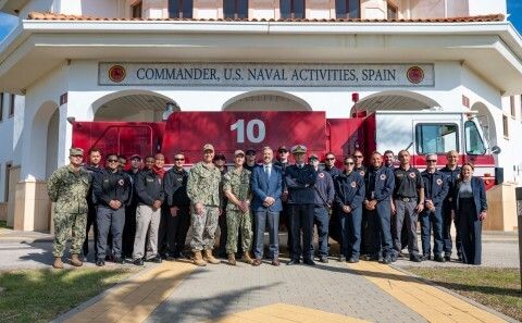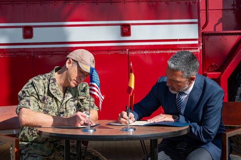 El alcalde de Rota, Javier Ruiz, junto al Capitán de Navío Comandante de las Actividades Navales Americanas, T. J. Suárez, han formalizado esta mañana la cesión del camión de bomberos que a las 11 de la mañana salía de las instalaciones de la Base Naval para llegar a su nuevo destino, en el espacio expositivo del Base Forum en Rota, situado en la avenida de la Diputación.